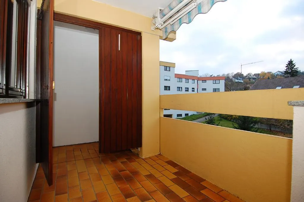 Der Zugang zum Balkon ist vom Wohnzimmer. Der ca. 6,5 m² große und überdachte West-Balkon ist mit einem Abstellraum und einer Markise ausgestattet.