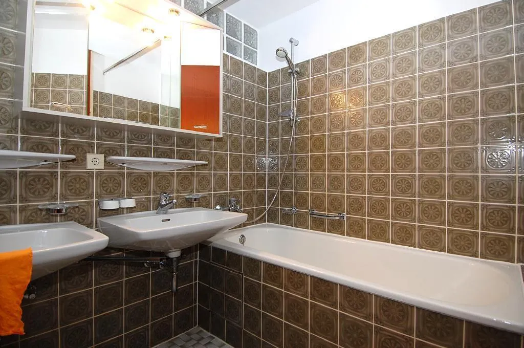 Das halbhoch geflieste Badezimmer ist ausgestattet mit einer Badewanne, zwei Waschbecken, einem Spiegelschrank und einem Waschmaschinenanschluss.