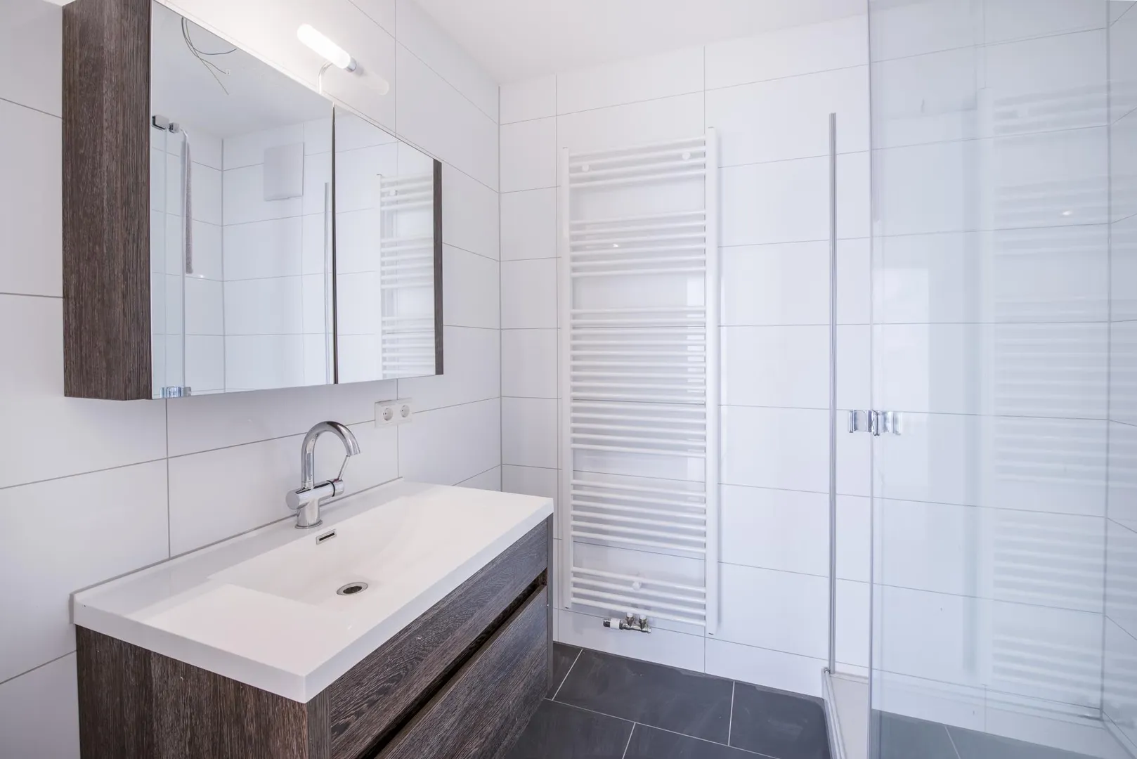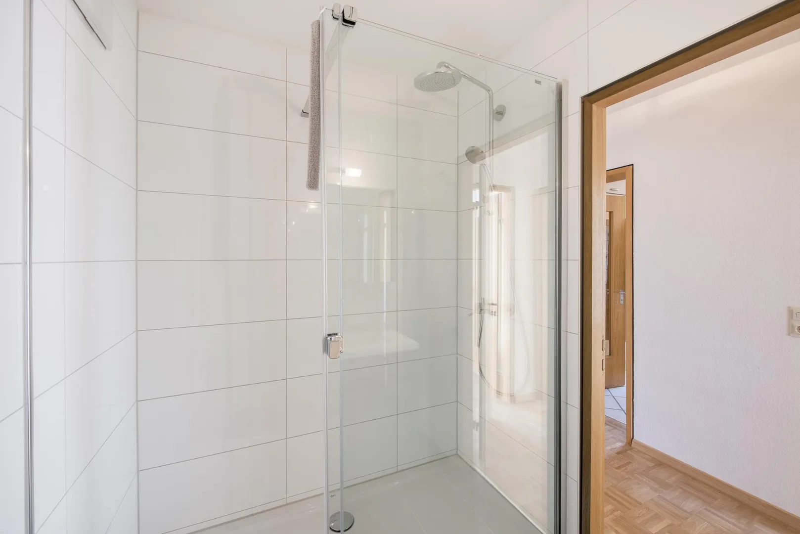 Das raumhoch geflieste Badezimmer wurde frisch modernisiert und ist mit einer bodentiefen Dusche, einem Fliesenboden, einem Waschtischunterschrank und einem Spiegelschrank ausgestattet.