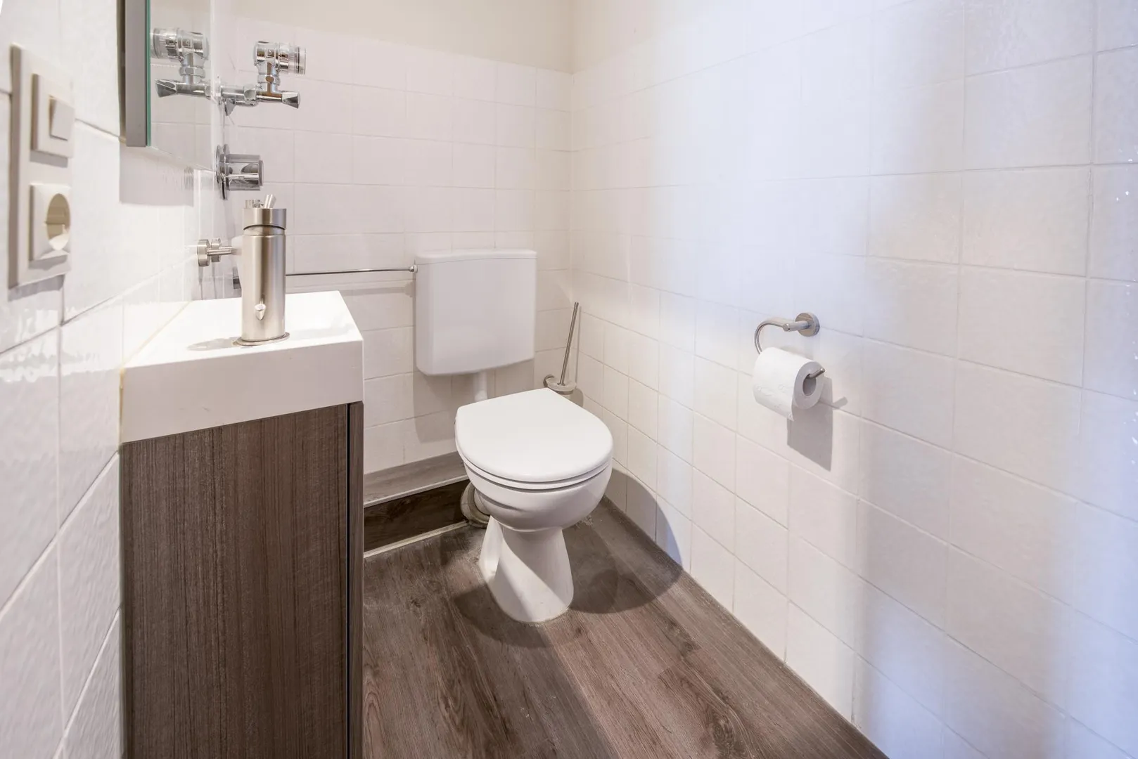 Das WC ist separat und ist mit einem Vinylboden, einem Spiegel und einem Waschtischunterschrank ausgestattet.