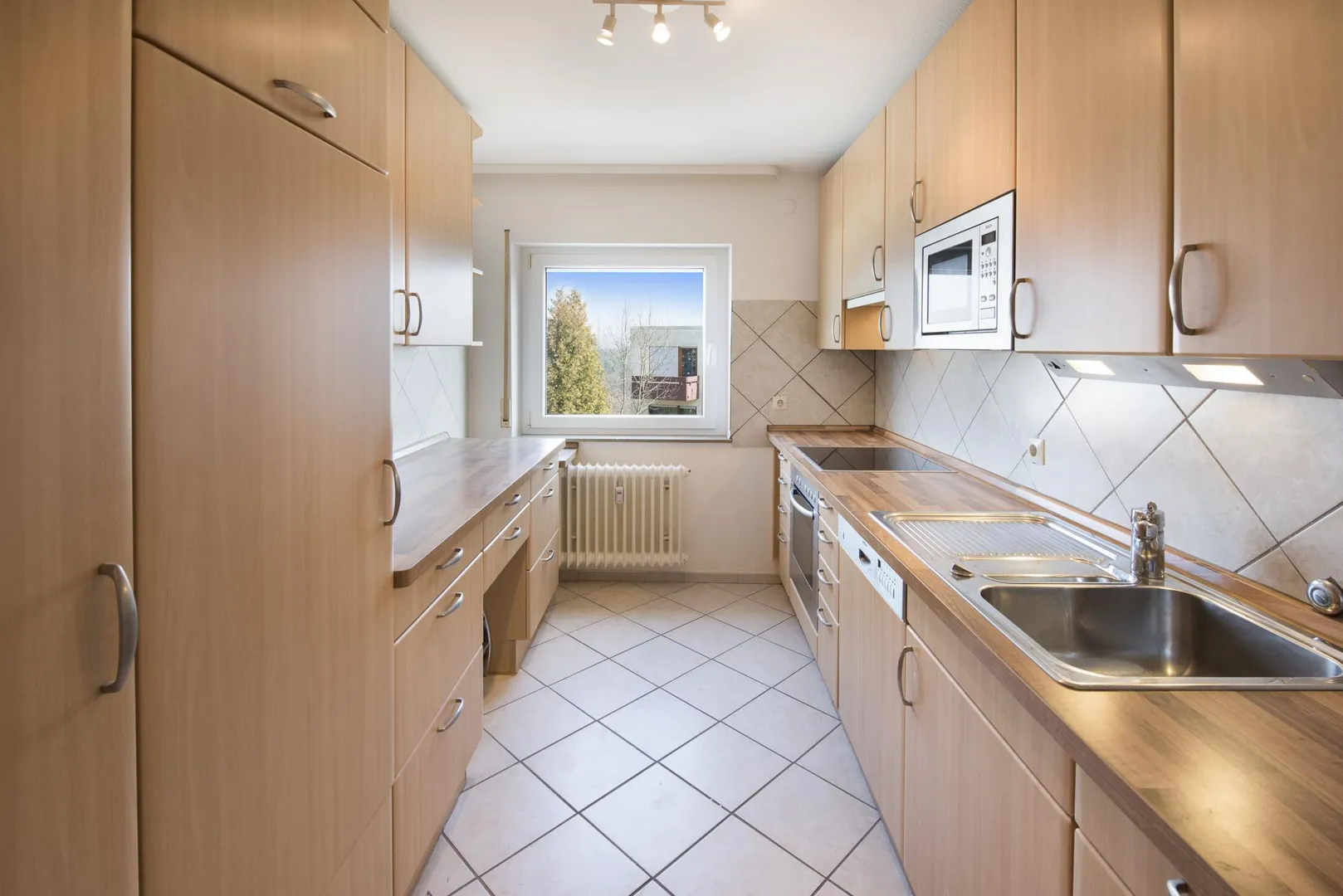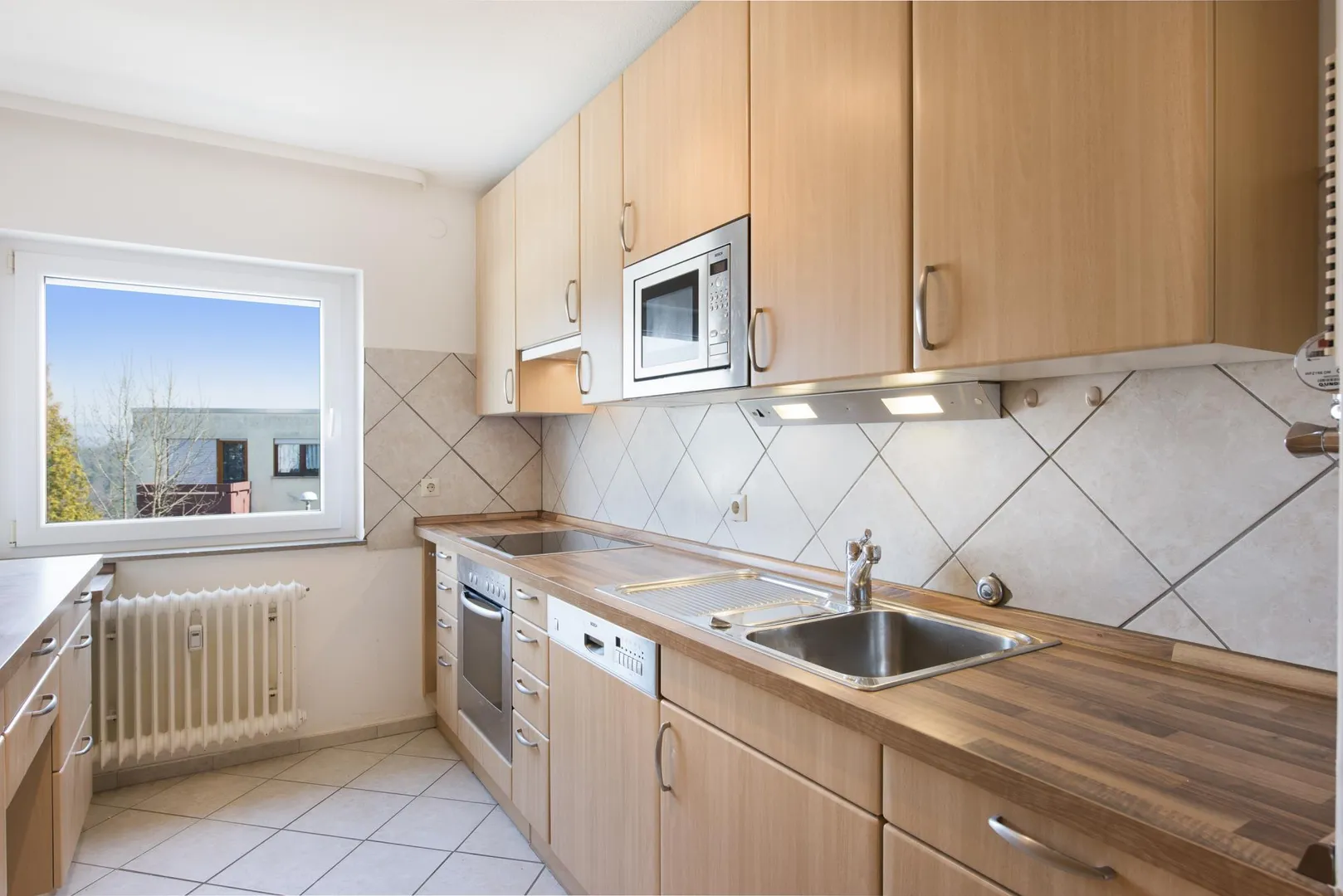 Die hochwertige Einbauküche ist ausgestattet mit einer Spülmaschine, einer Mikrowelle, einem Herd mit Backofen, einem Dunstabzug nach außen, einem Kühl- und Gefrierschrank sowie Ober- und Unterschränken. Die Elektrogeräte befinden sich in einem sehr guten Zustand. Für die künftige Funktionsfähigkeit der E-Geräte übernimmt der Vermieter keine Haftung.