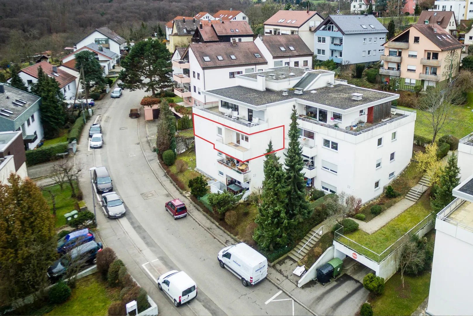 Durch die Hanglage befindet sich die Wohnung von der Straßenseite aus im 2. Obergeschoss. Der Zugang zum Haus erfolgt über mehrere Treppenstufen.