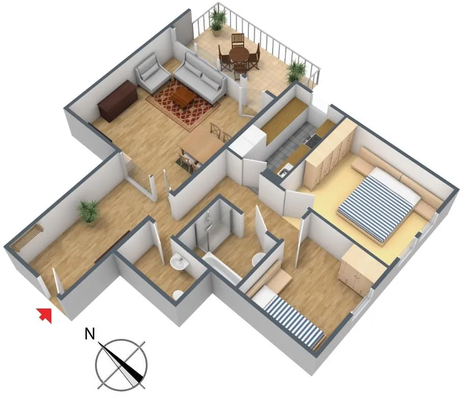 Das Wohnzimmer und die Küche sind nach Osten ausgerichtet. Das Schlafzimmer und das Kinderzimmer sind nach Süden ausgerichtet.