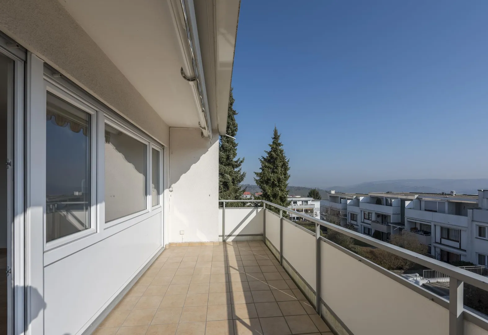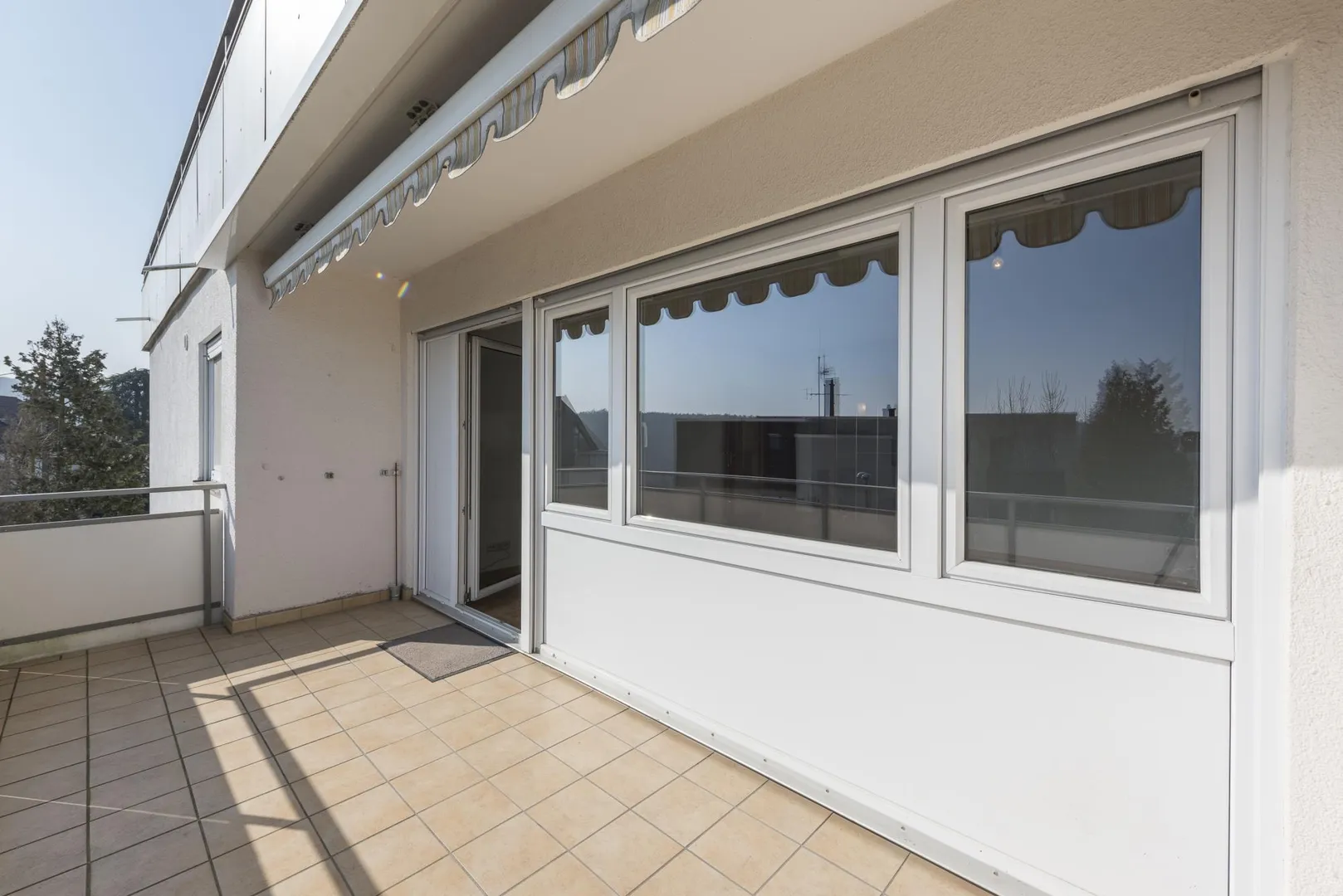 Der ca. 10 m² große Ost-Balkon mit tollem Fernblick ist teilüberdacht, mit einer elektrischen Markise ausgestattet und ist vom Wohnzimmer begehbar.