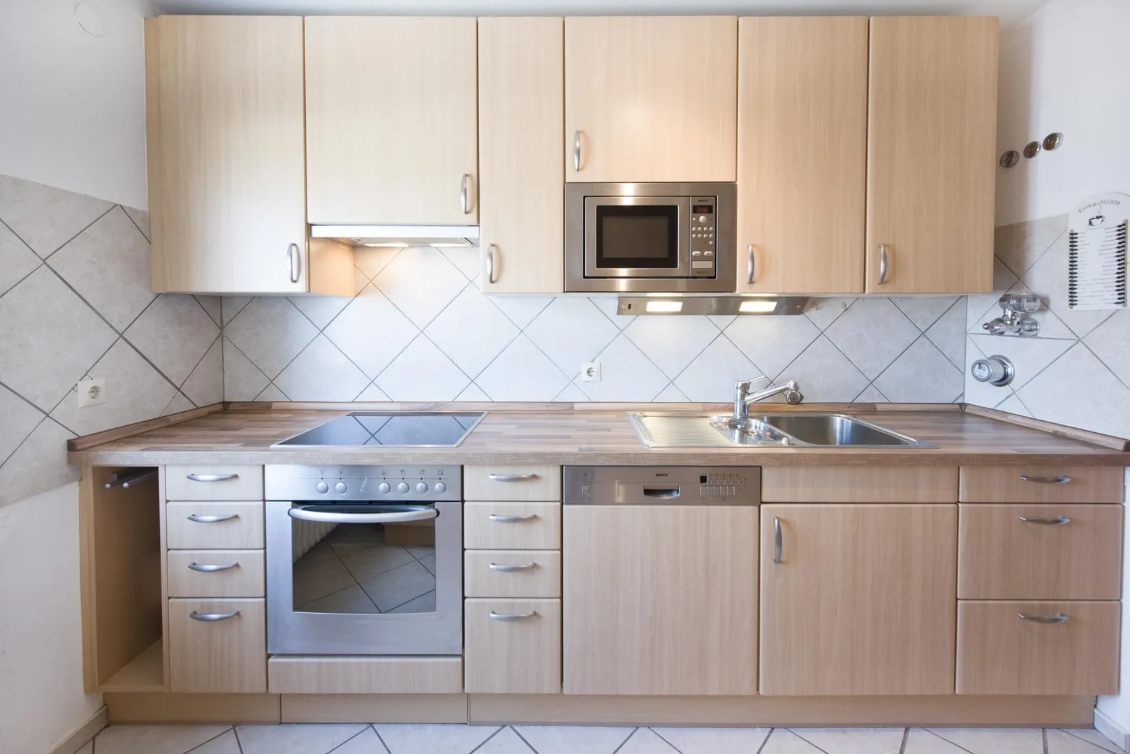 Die hochwertige Einbauküche ist ausgestattet mit einer Spülmaschine, einer Mikrowelle, einem Herd mit Backofen, einem Dunstabzug nach außen, einem Kühl- und Gefrierschrank sowie Ober- und Unterschränken. Die Elektrogeräte befinden sich in einem sehr guten Zustand. Für die künftige Funktionsfähigkeit der E-Geräte übernimmt der Vermieter keine Haftung.
