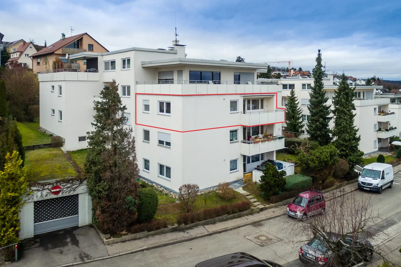 Durch die Hanglage befindet sich die Wohnung von der Straßenseite aus im 2. Obergeschoss. Der Zugang zum Haus erfolgt über mehrere Treppenstufen.