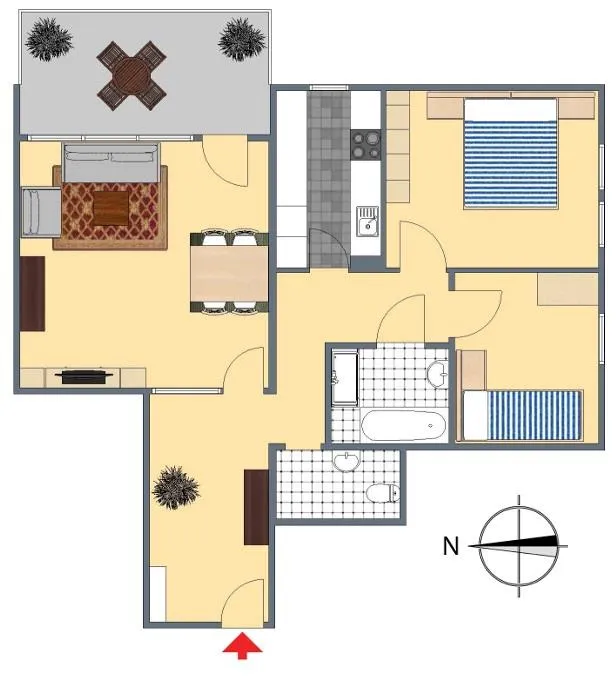 Das Wohnzimmer und die Küche sind nach Osten ausgerichtet. Das Schlafzimmer und das Kinderzimmer sind nach Süden ausgerichtet.