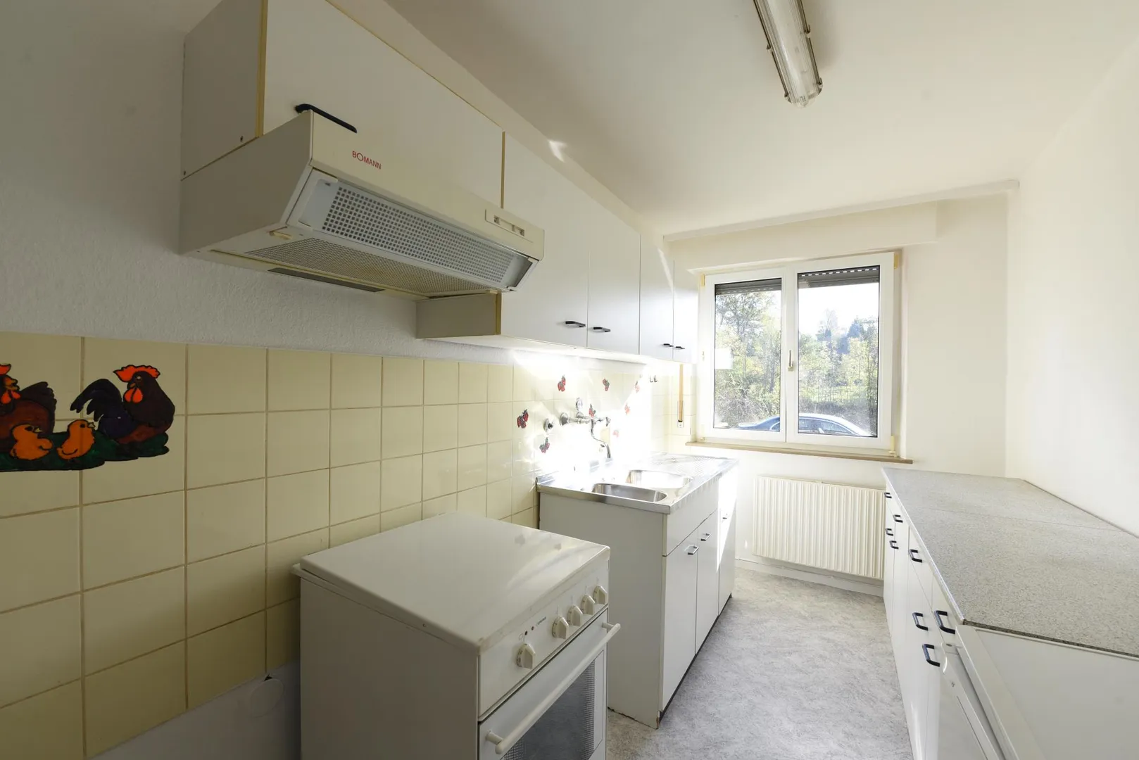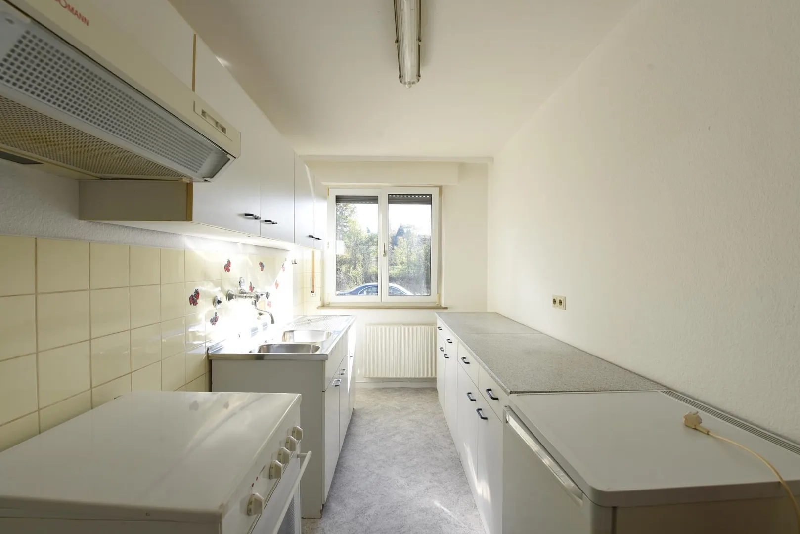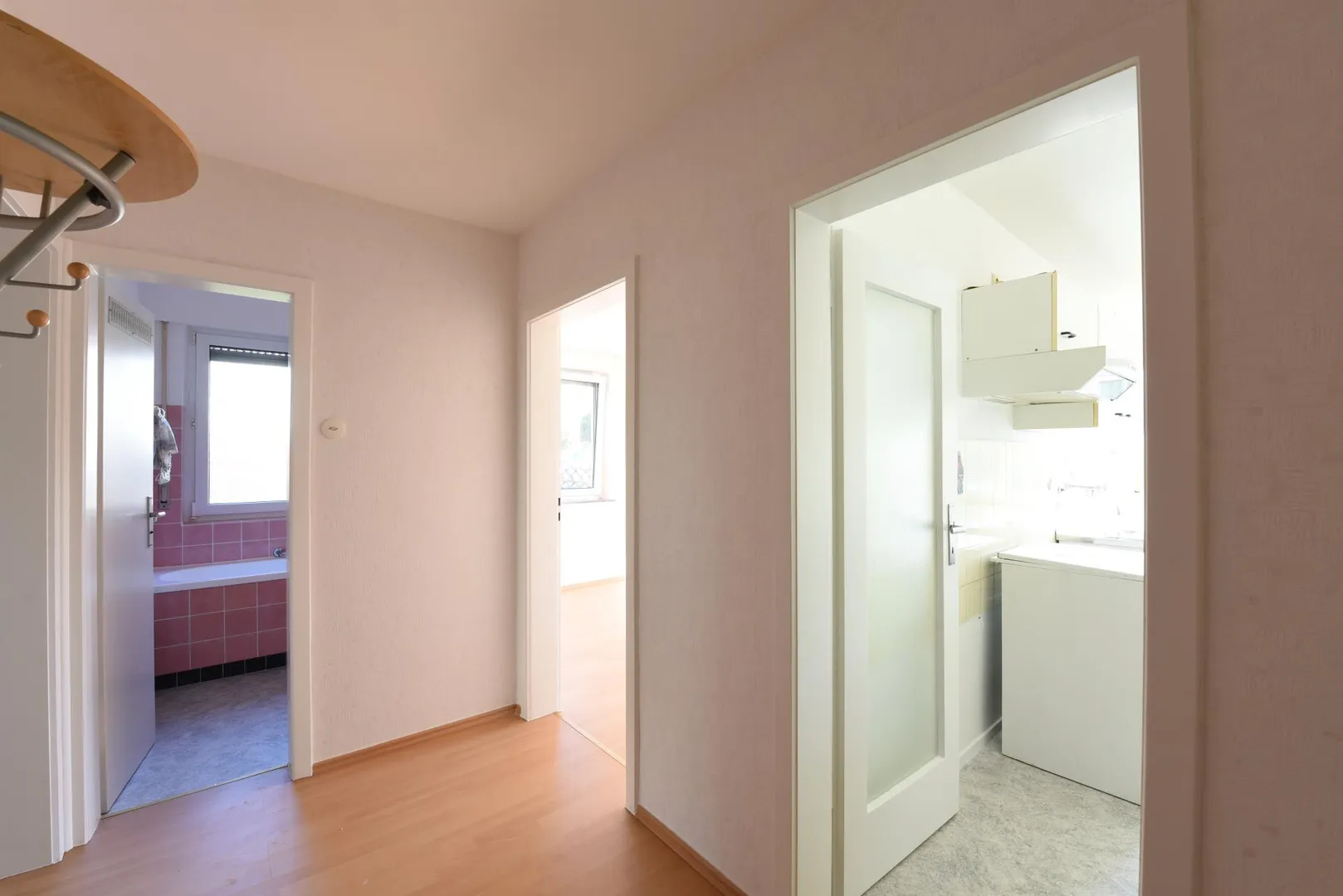 Im Flur befindet sich ein Einbauschrank. Die Küche ist mit einer Einbauküche mit Platz für Waschmaschine ausgestattet. Ein Spülmaschinenanschluss ist nicht vorhanden.