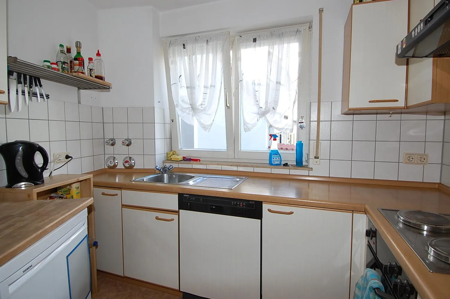 Die Küche verfügt über einen PVC Boden und eine ältere Einbauküche. Die Einbauküche ist ausgestattet mit einem Kühlschrank mit Gefrierfach, einer Spülmaschine, einem Herd mit Backofen, einer Dunstabzugshaube, Ober- und Unterschränken. Die E-Geräte sind alle funktionsfähig. Für die Funktionsfähigkeit der E-Geräte in der Zukunft übernimmt der Vermieter keine Haftung.