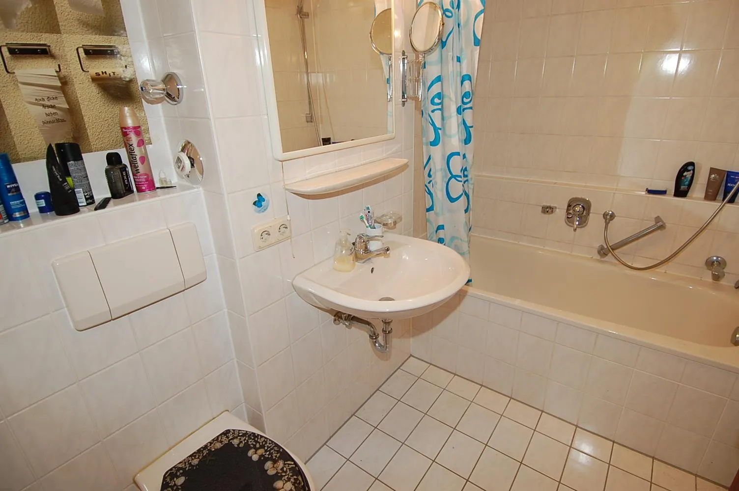 Das innenliegende, raumhoch geflieste Badezimmer ist ausgestattet mit einem Fliesenboden, einer Wanne und einem WC.