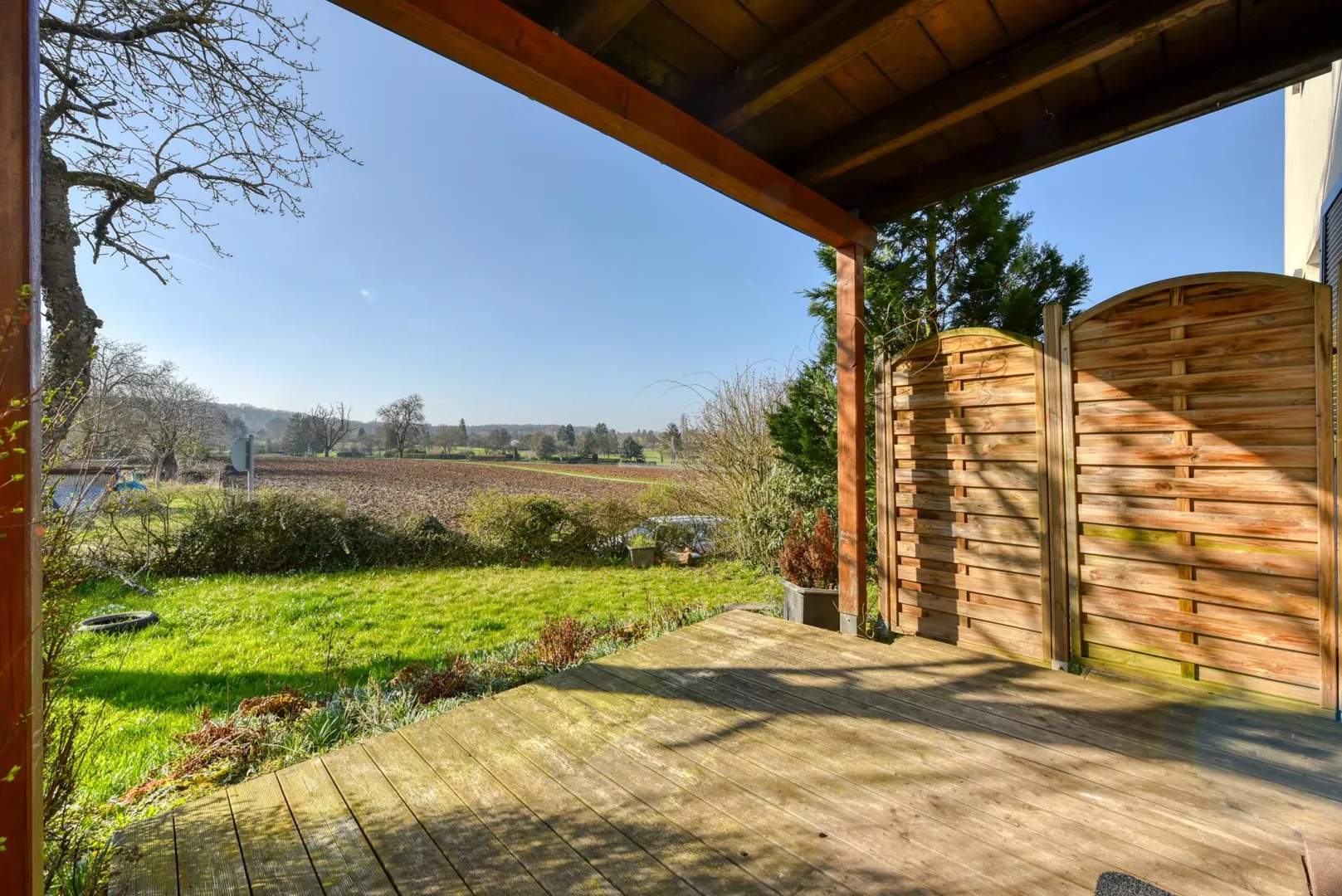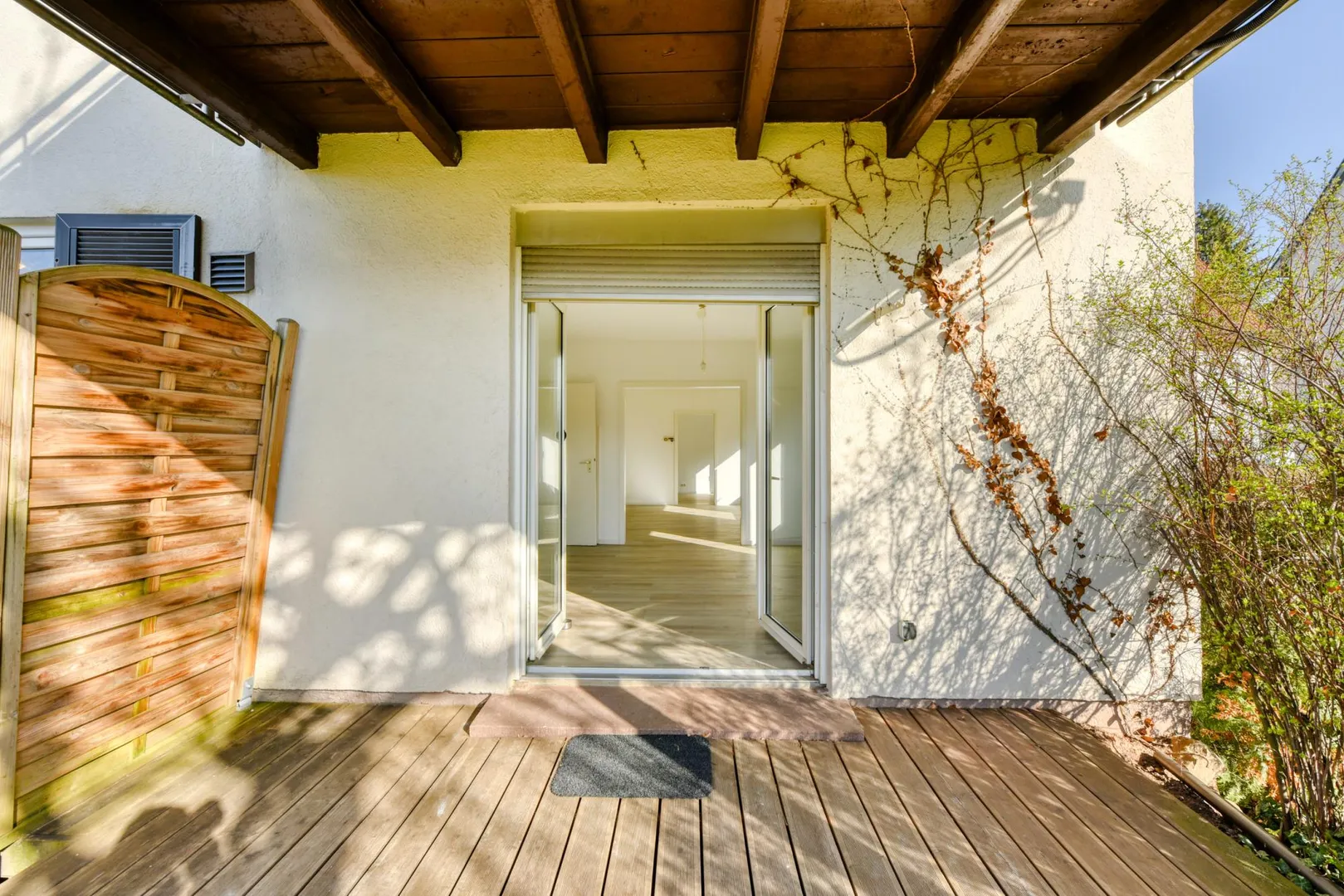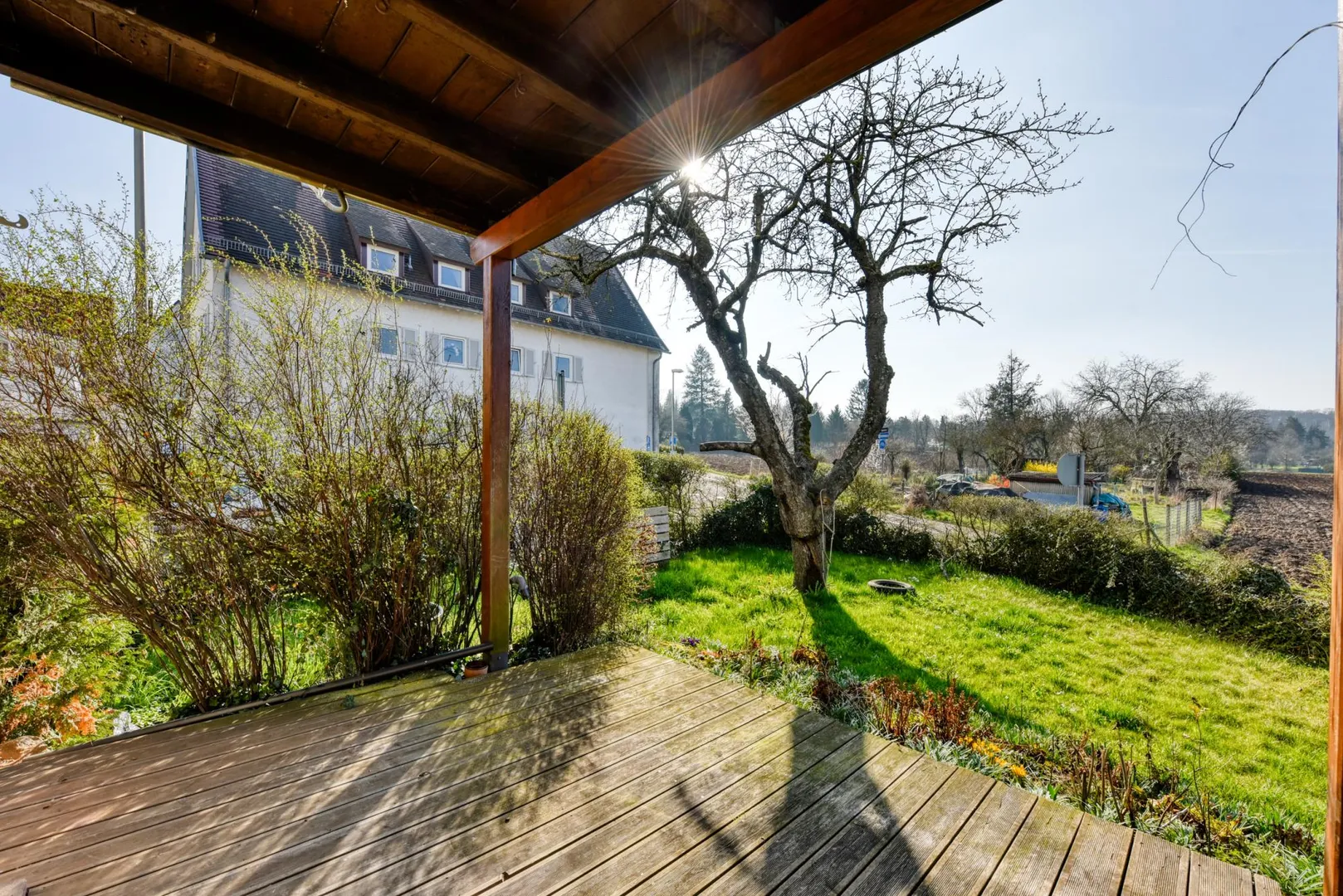 Die überdachte Terrasse sowie der Garten sind nach Westen ausgerichtet. Direkt auf der anderen Straßenseite befinden sich die Felder und Schrebergärten.