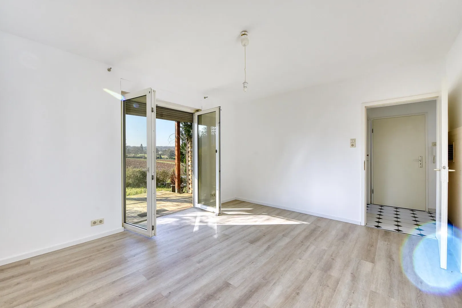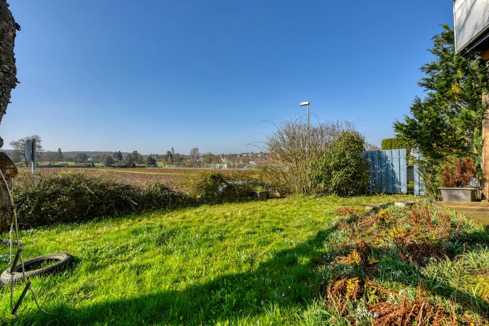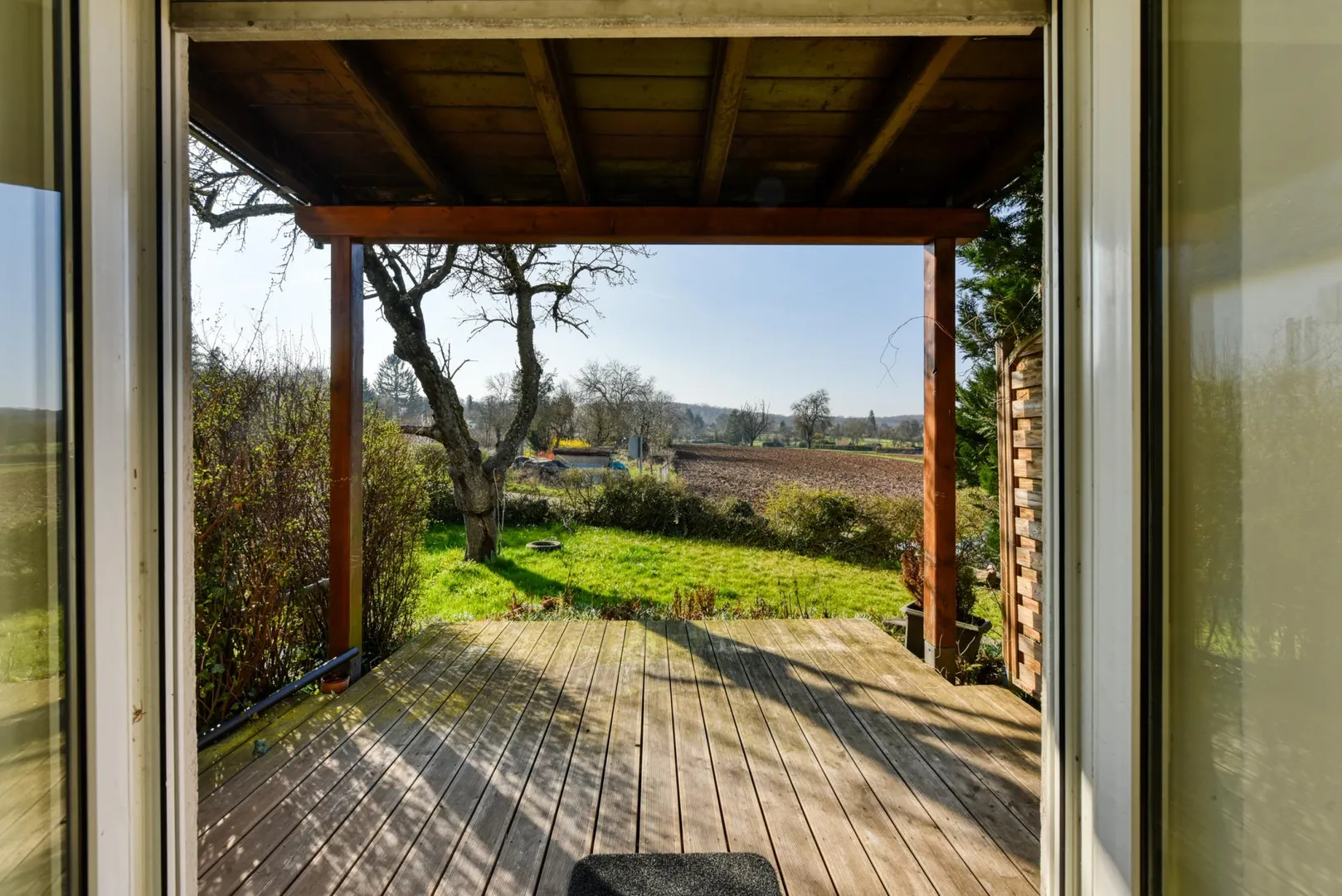 Die überdachte Terrasse sowie der Garten sind nach Westen ausgerichtet. Direkt auf der anderen Straßenseite befinden sich die Felder und Schrebergärten.