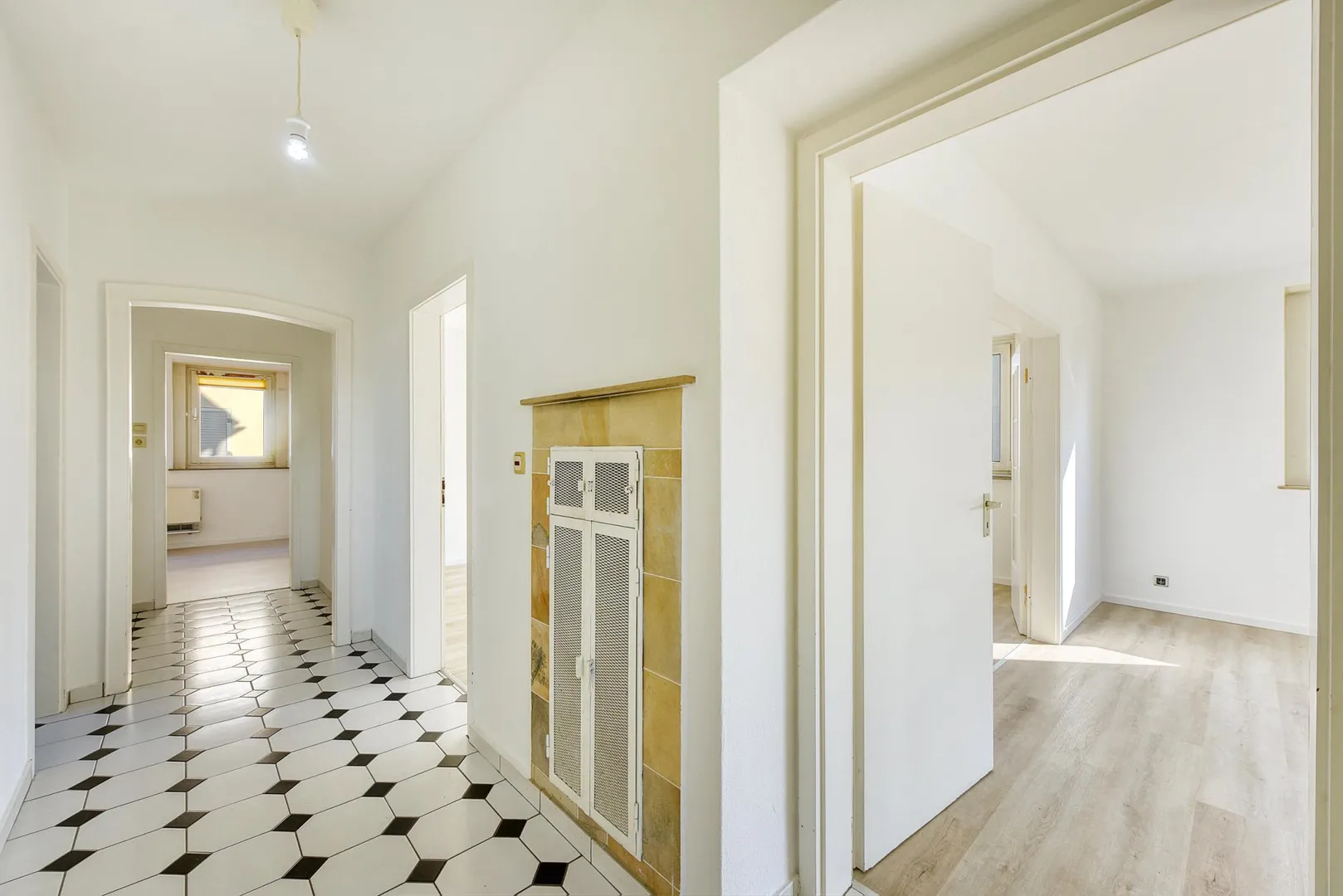 Die Böden im Flur, im Badezimmer sowie in der Küche sind gefliest.
