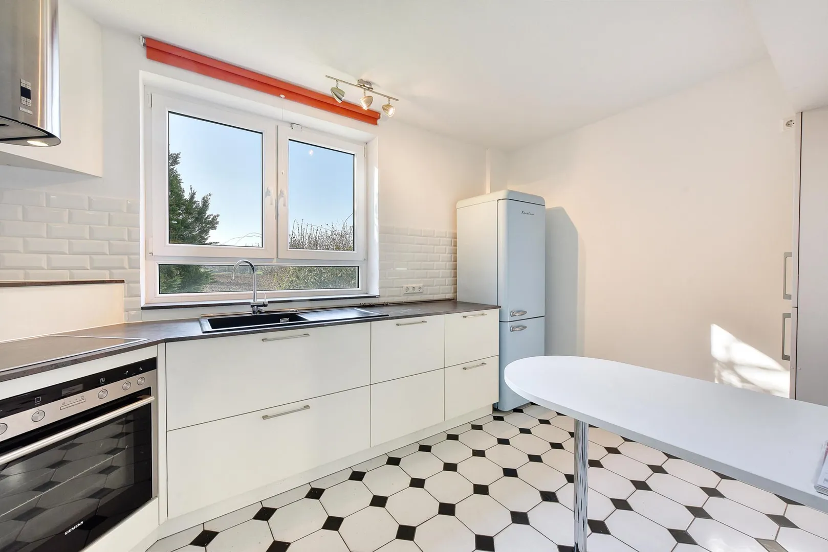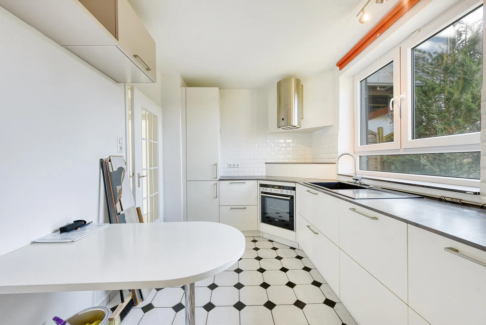 Die Küche ist mit einer Einbauküche von 2021 sowie Außenabzug ausgestattet. Für die künftige Funktionsfähigkeit der Elektro-Geräte übernimmt der Vermieter keine Haftung.