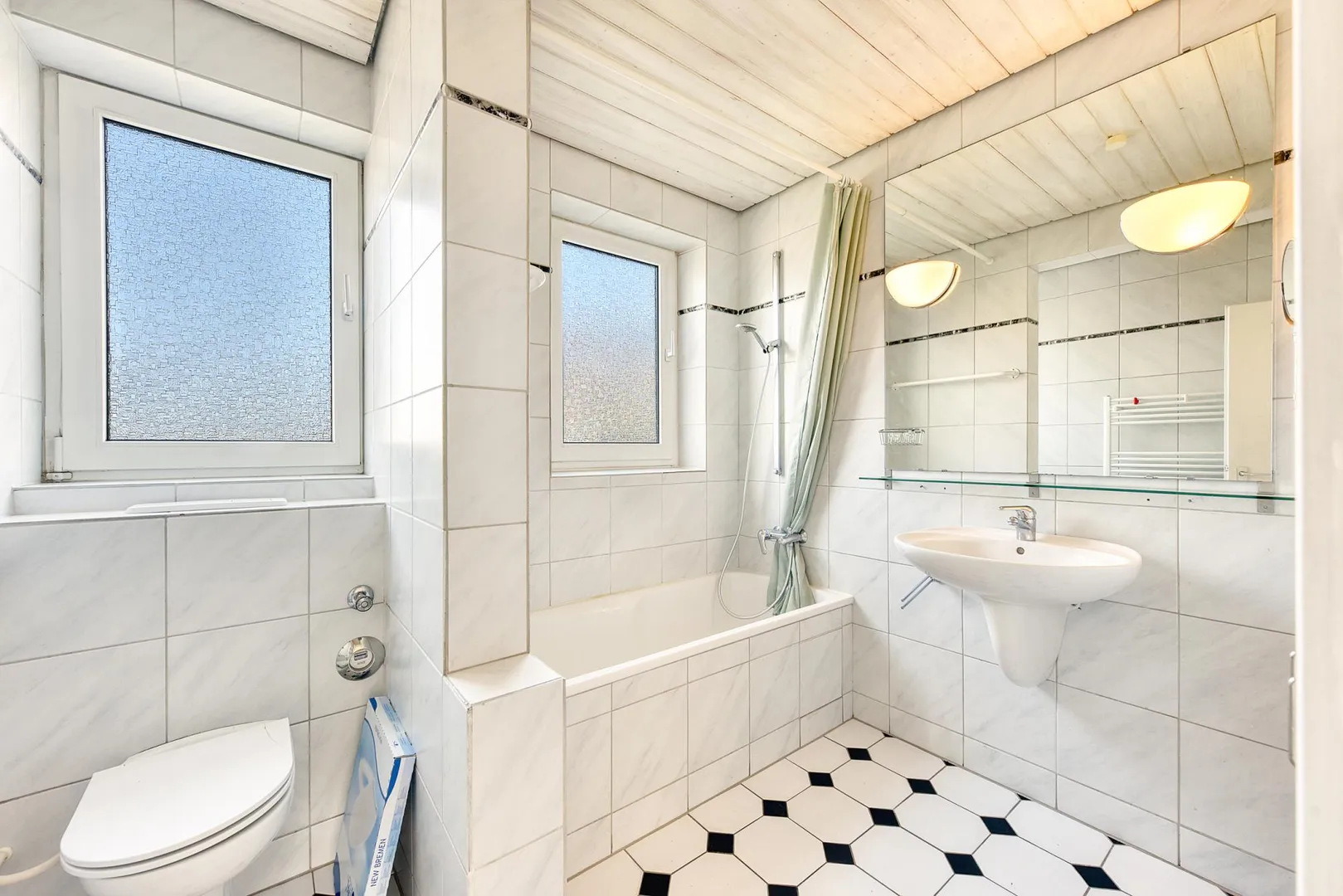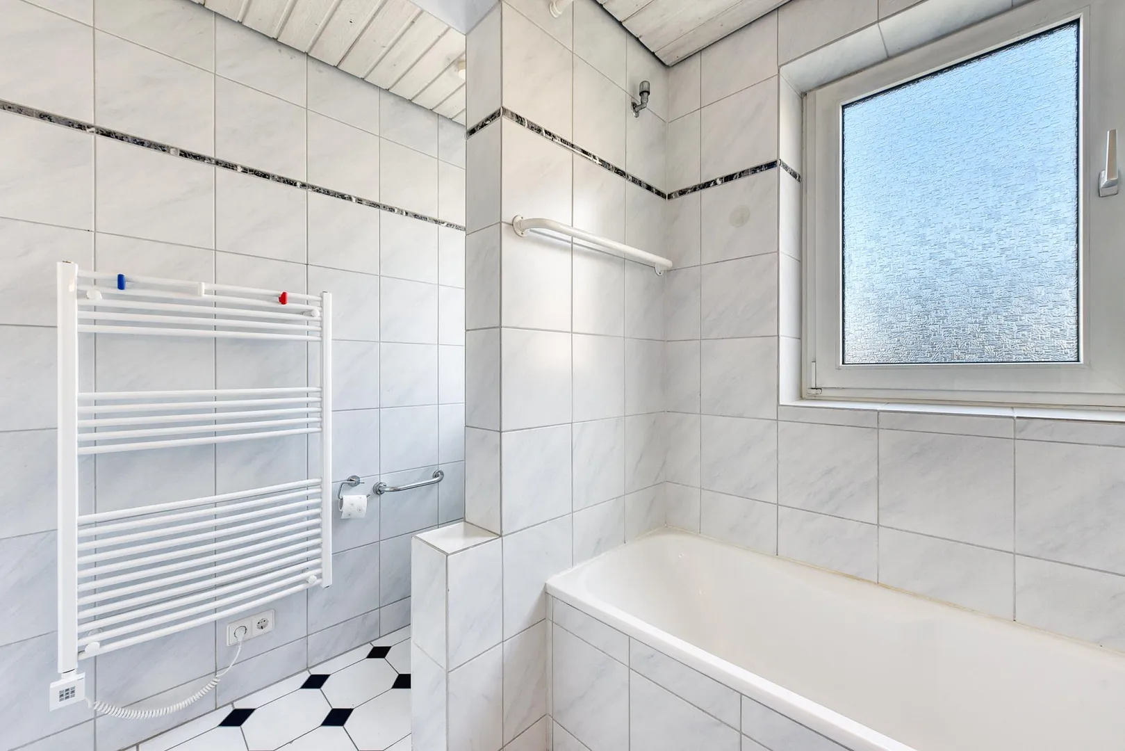 Das raumhoch geflieste Tageslicht-Bad ist ausgestattet mit einer Badewanne, einem WC sowie einem Handtuch-Heizkörper.