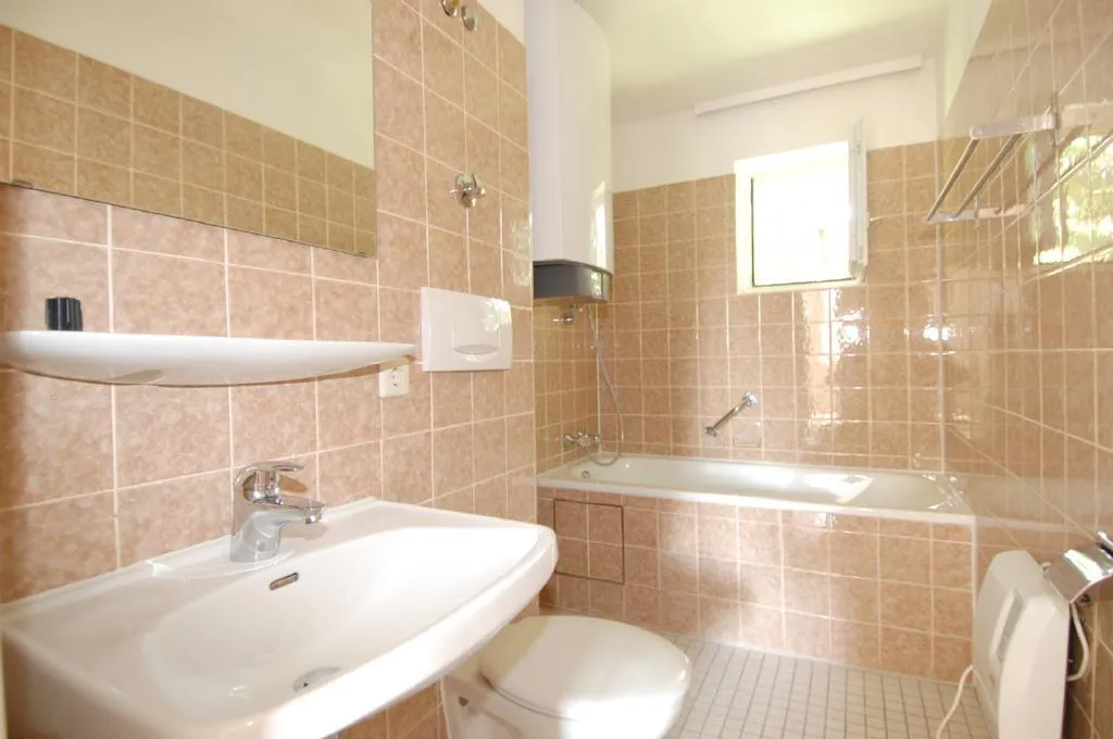 Das modernisierte Bad ist raumhoch gefliest und mit weissem Mosaik-Fliesenboden, Waschmaschinenanschluss, Fenster, Badewanne und WC ausgestattet.