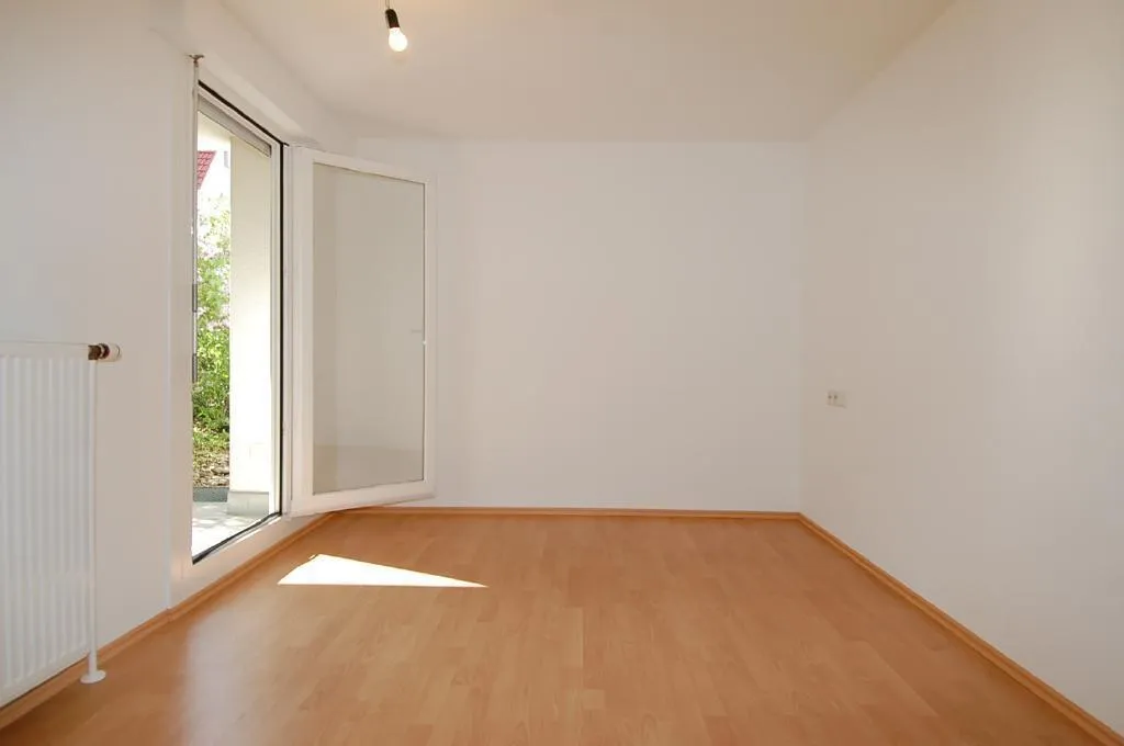 Die ca. 5m² große, überdachte Terrasse erreichen Sie sowohl vom Wohn- als auch vom Schlafzimmer.