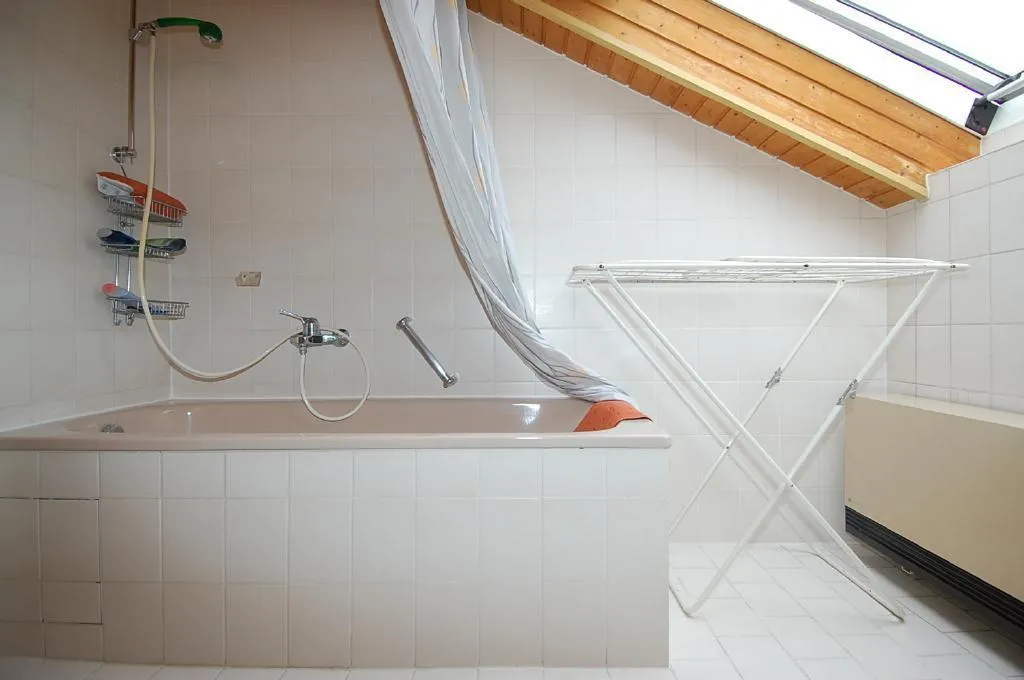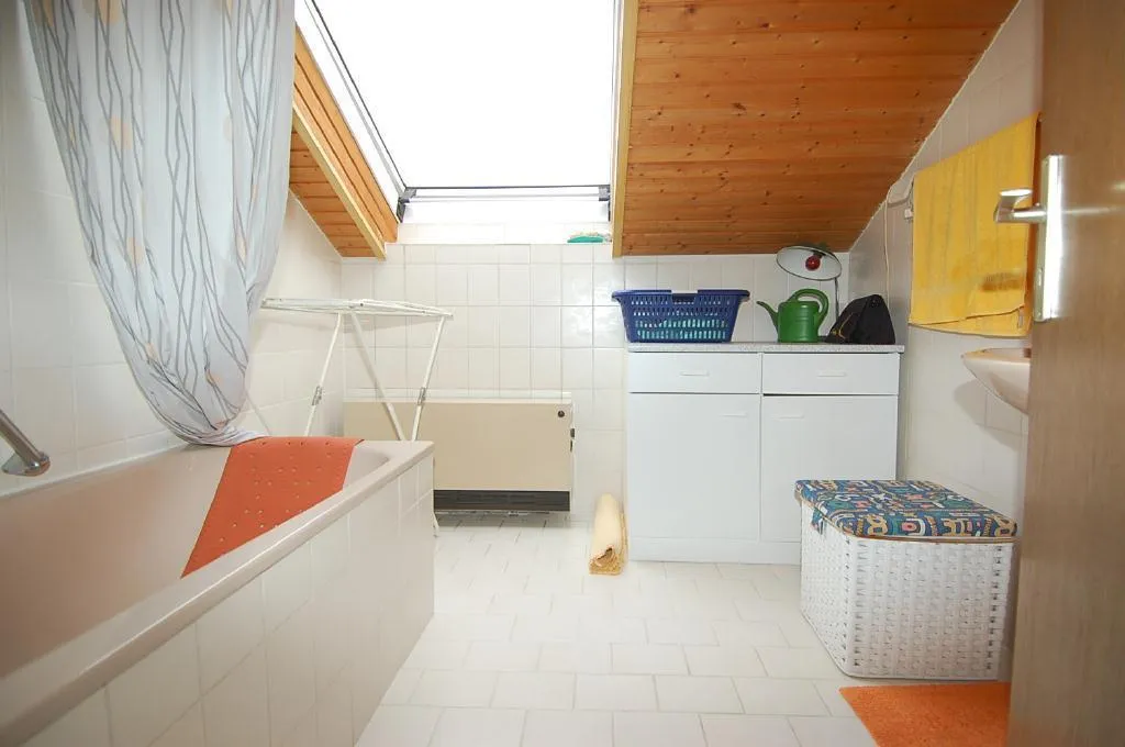 Das Badzimmer ist raumhoch gefliest und verfügt über eine Badewanne mit Duschmöglichkeit.