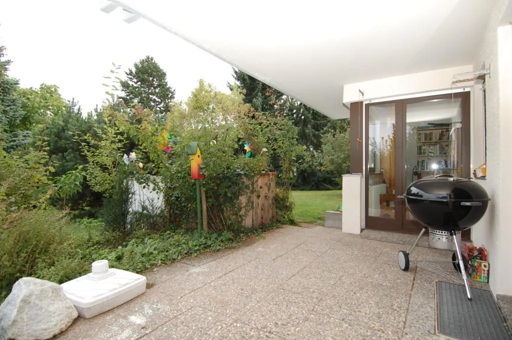 Die überdachte, ca. 14 m² große Terrasse ist über das Wohnzimmer und über das Schlafzimmer begehbar. Die Terrasse und der gemeinschaftliche Garten sind nach Osten ausgerichtet.