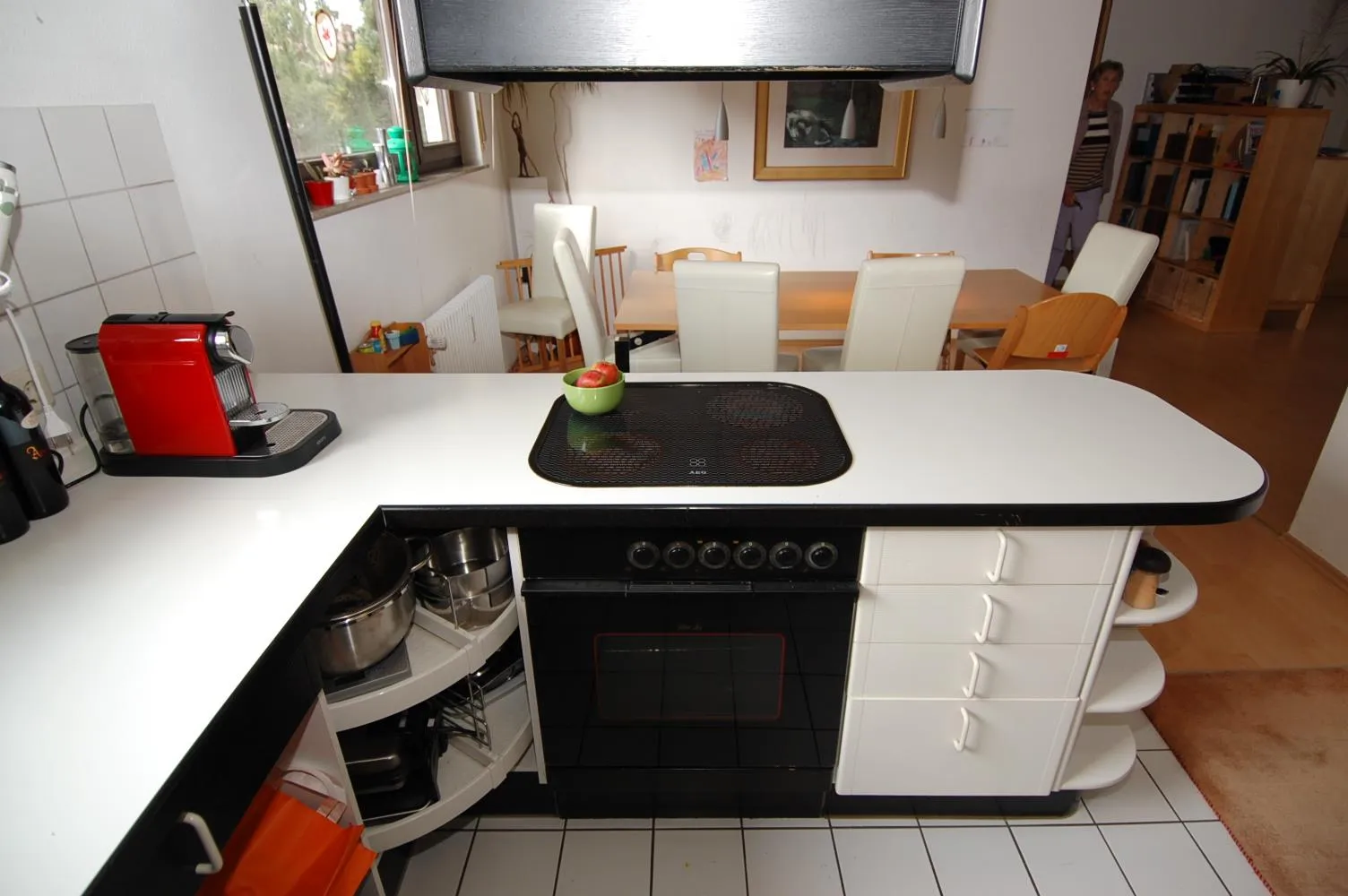 Die Küche ist zum Essbereich offen und ist mit einer älteren Einbauküche, ohne Spülmaschine ausgestattet. Die E-Geräte sind aktuell funktionsfähig. Für die künftige Funktionsfähigkeit der E-Geräte übernimmt der Vermieter keine Haftung.