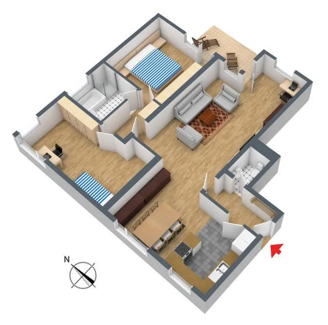 Der Grundriss ist relativ offen gestaltet. Über den großen und offenen Wohn-Ess- und Küchenbereich geht es über einen weiteren Flur zu den Zimmern und ins Badezimmer.