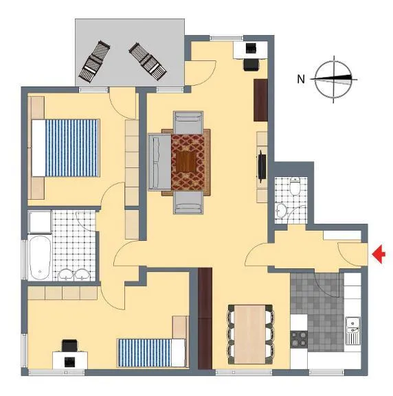 Diese großzügige 3 1/2 Zimmer-Wohnung mit Terrasse befindet sich im Erdgeschoss.