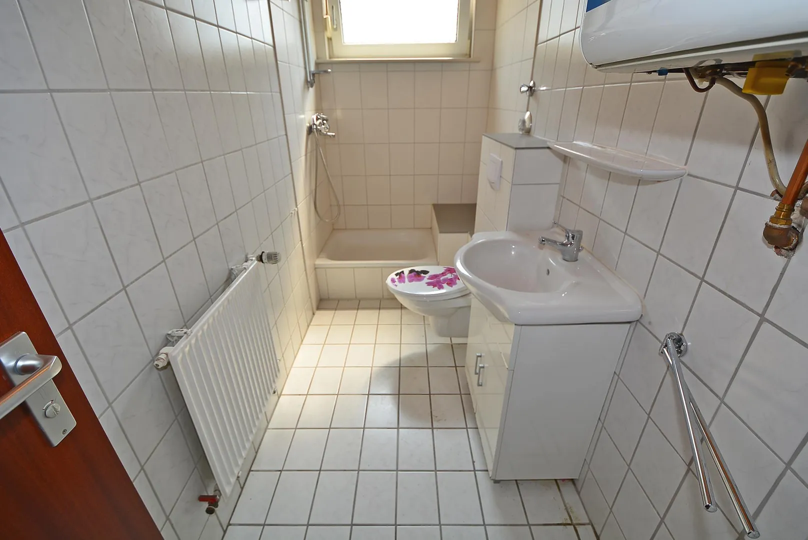 Das raumhoch geflieste Tageslicht-Badezimmer aus den 90ern ist mit einer Dusche, einem Waschbecken sowie einem WC ausgestattet.