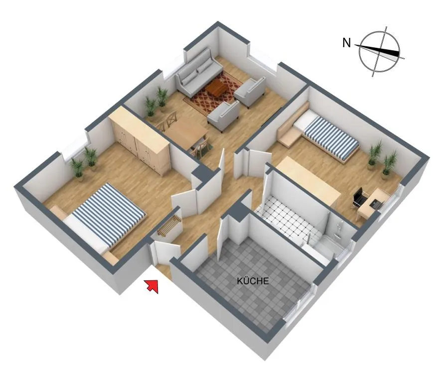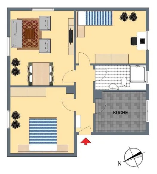 Das Wohnzimmer ist nach Nordosten ausgerichtet. Das Schlafzimmer ist nach Norden ausgerichtet. Das Kinderzimmer, die Küche sowie das Bad sind nach Süden ausgerichtet.