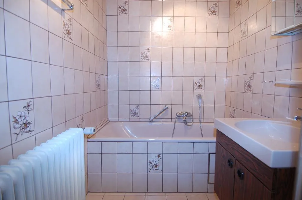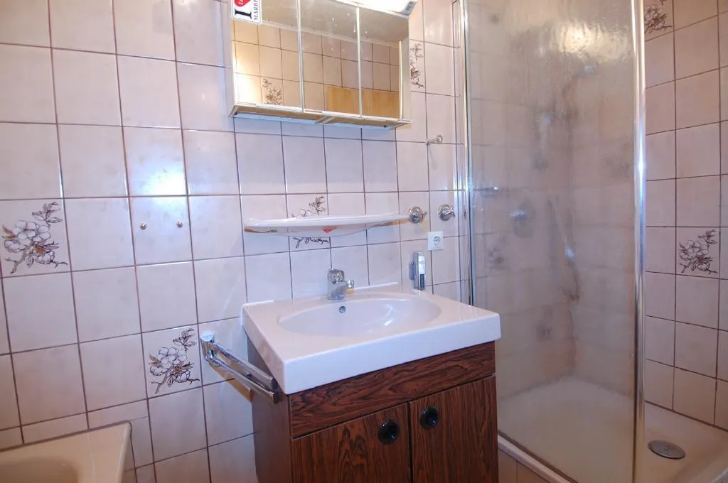 Das Badezimmer ist gepflegt. Das Bad ist innenliegend und ist ausgestattet mit einer Badewanne und einer Dusche. Das Bad ist raumhoch mit bräunlichen Fliesen gefliest.