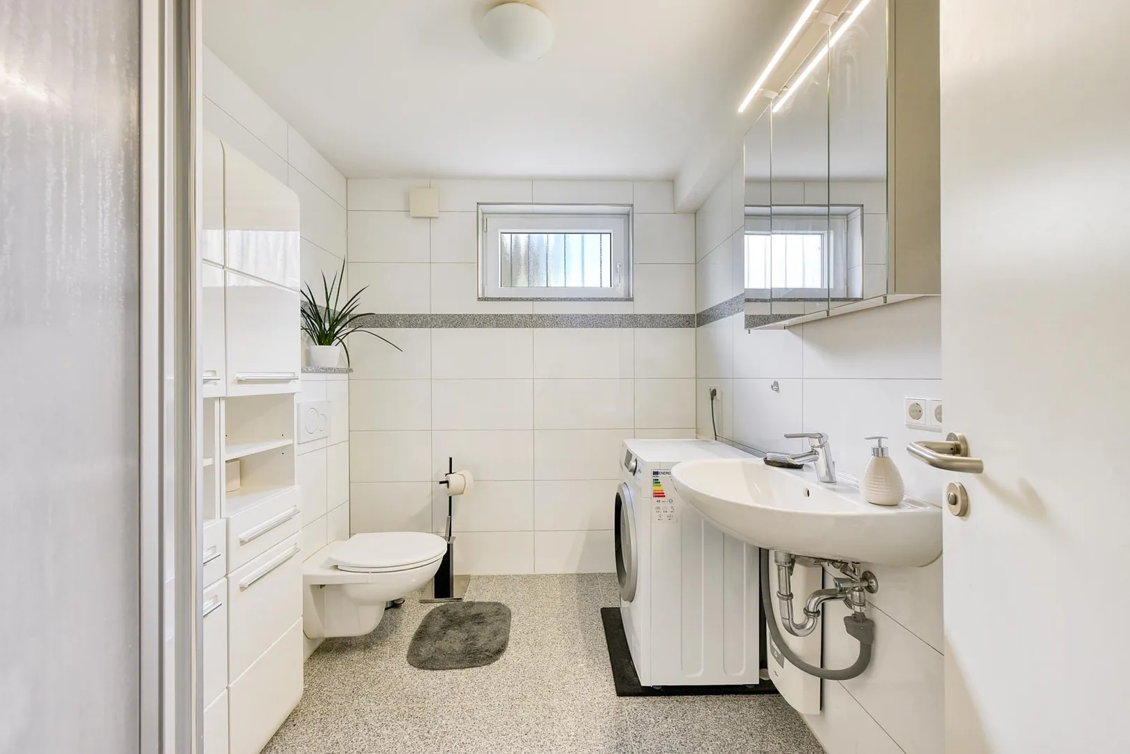 Das raumhoch geflieste Bad mit Fenster verfügt über einen Granit-Fliesenboden, eine Dusche, ein WC, einen Handtuchheizkörper sowie über einen Waschmaschinenanschluss. Die Badmöbel können vom Vormieter übernommen werden.