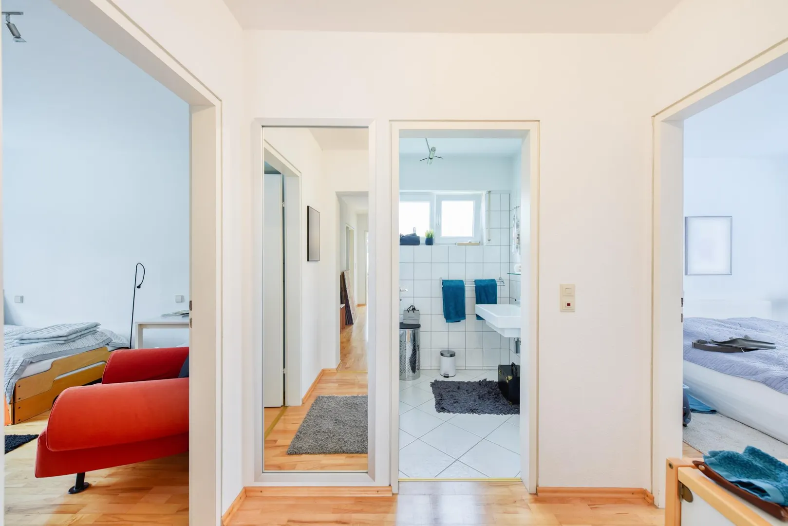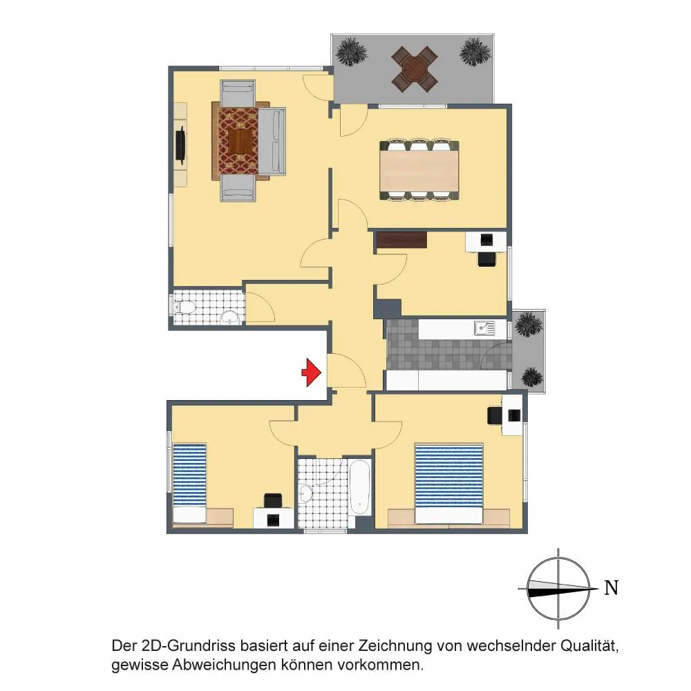 Der Grundriss ist sehr gut. Alle Räume sind direkt vom Flur begehbar. Das Badezimmer sowie das separate WC verfügen jeweils über ein Fenster. Der knapp 9 m² große und überdachte West-Balkon ist über den Essbereich begehbar. Der ca. 2 m² große Nord-Balkon ist über die Küche begehbar.