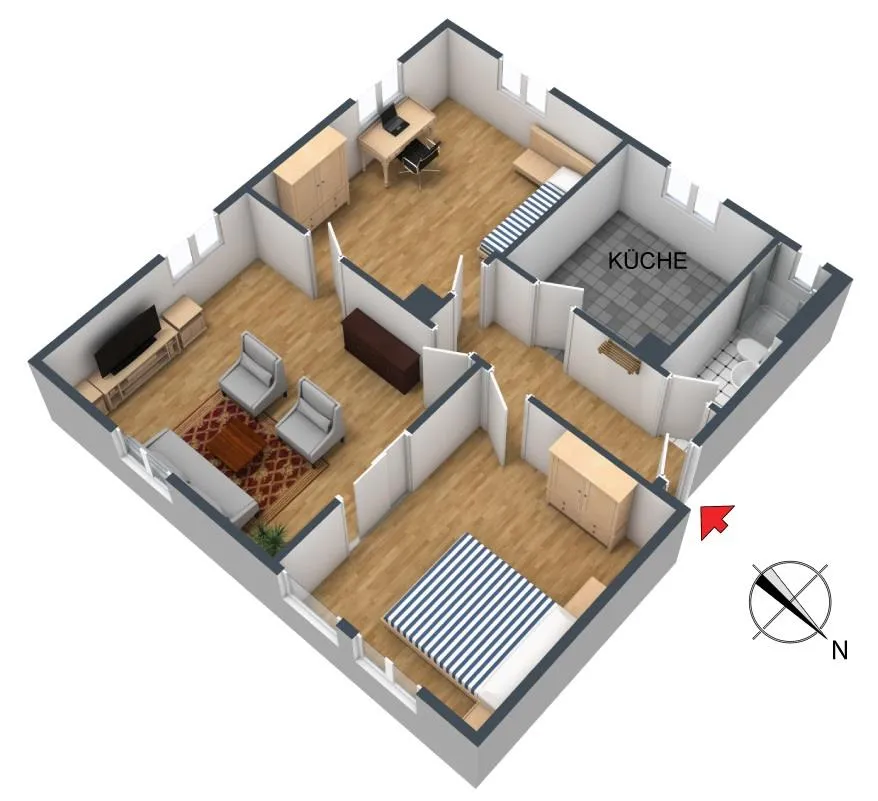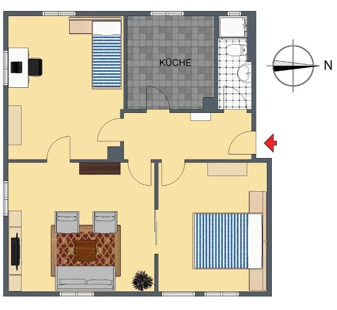 Der Grundriss ist gut. Alle Räume sind direkt vom Flur begehbar. Das Badezimmer verfügt über ein Fenster.