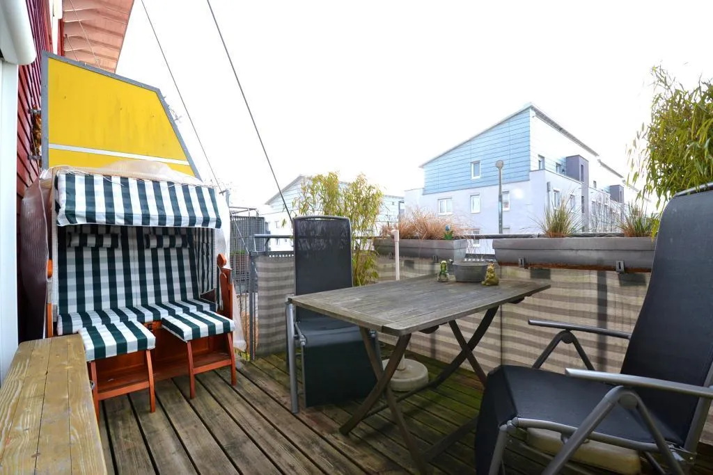 Der Wohnbereich und der Balkon sind nach Süd-West ausgerichtet. Der Balkon ist ca. 10 m² groß. Die Kippfunktion bei der Balkontür ist defekt.