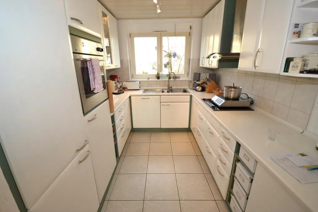 Die Küche ist mit einer älteren Einbauküche und Außenabzug ausgestattet.