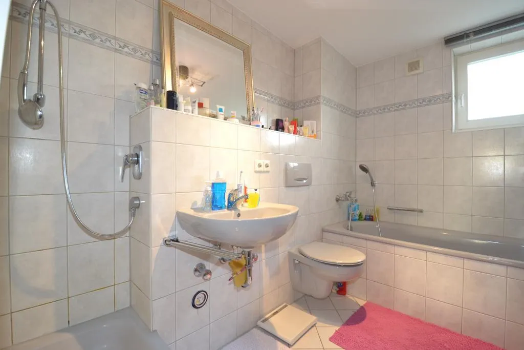 Das raumhoch geflieste Badezimmer mit Fenster ist ausgestattet mit einem Fliesenboden, einer Badewanne, einer Dusche, einem WC und einem Handtuchheizkörper.