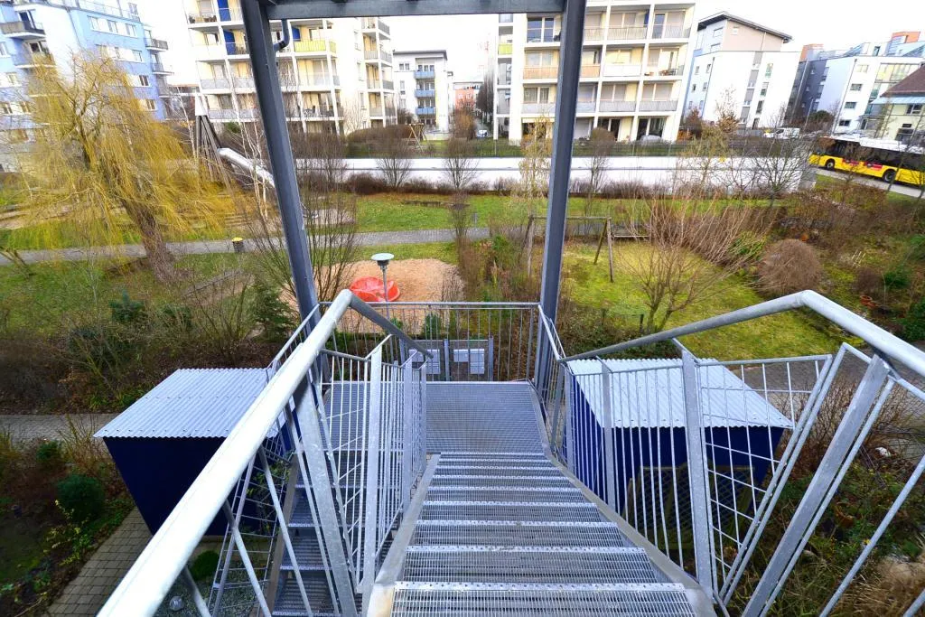 Die Wohnung ist über ein Außen-Treppenhaus erreichbar. Auf dem Geschoss befinden sich drei Wohnungen. Vor dem Wohnungseingang gibt es noch eine kleine "Terrasse".