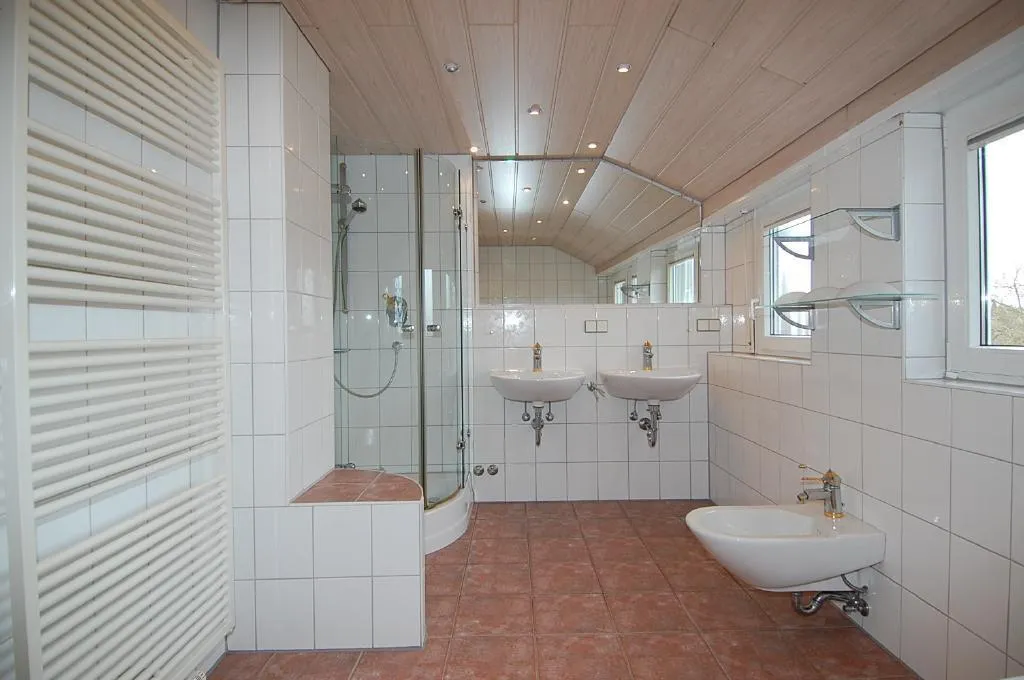 Das Hauptbad ist raumhoch gefliest. Es ist ausgestattet mit 3 Fenster, 2 Waschbecken, einer Dusche, einer Eckbadewanne, einem Handtuchheizkörper und einem Bidet.