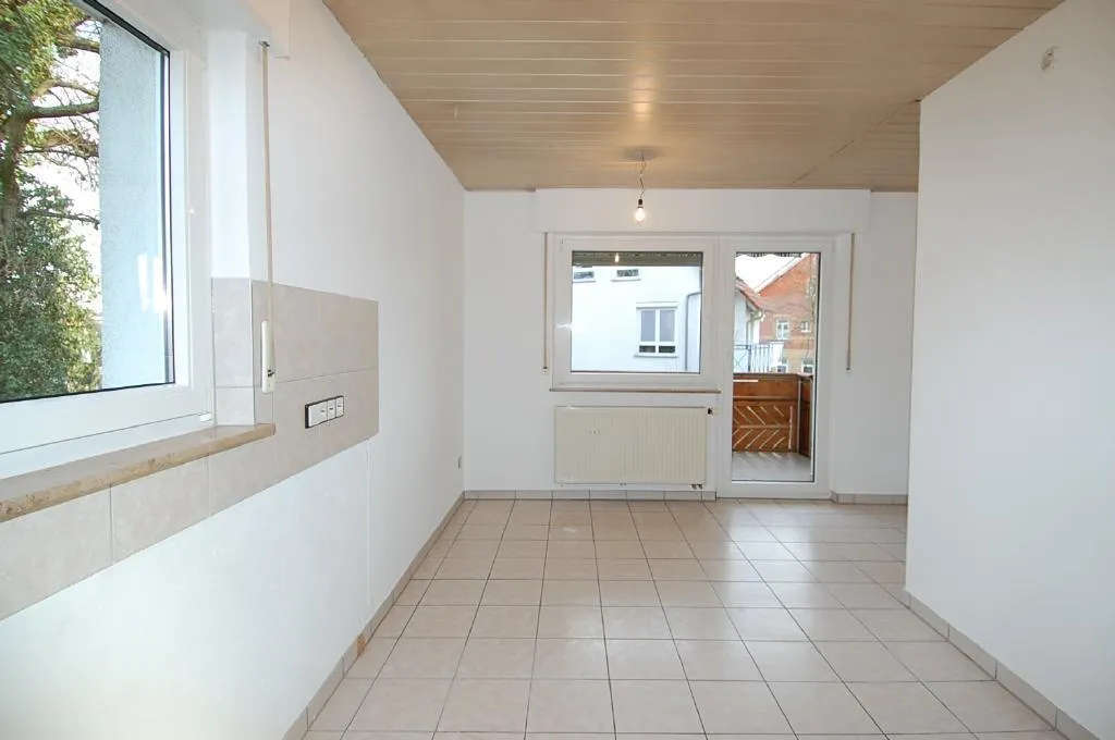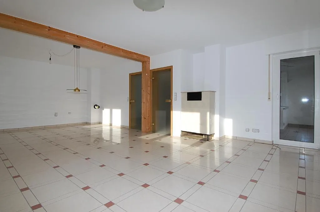 Das komplette Obergeschoss ist gefliest. Dort befindet sich ein Tageslichtbadezimmer. Es ist raumhoch gefliest und ausgestattet mit einer Dusche und einem WC. Die Küche ist ausreichend groß, sodaß eine Essecke dort integriert werden kann. Ferner befinden sich im Obergeschoss das ca. 15m² große Schlafzimmer und das ca. 37m² Wohnzimmer. Vom Wohnzimmer und vom Essbereich gibt es einen Zugang zum Ost-Süd Balkon. Der Balkon ist teilweise überdacht und mit einer Markise ausgestattet. Im Wohnzimmer gibt es zusätzlich zur normalen Heizung einen Kachelofen. Anschluß für offenen Kamin ist vorhanden.