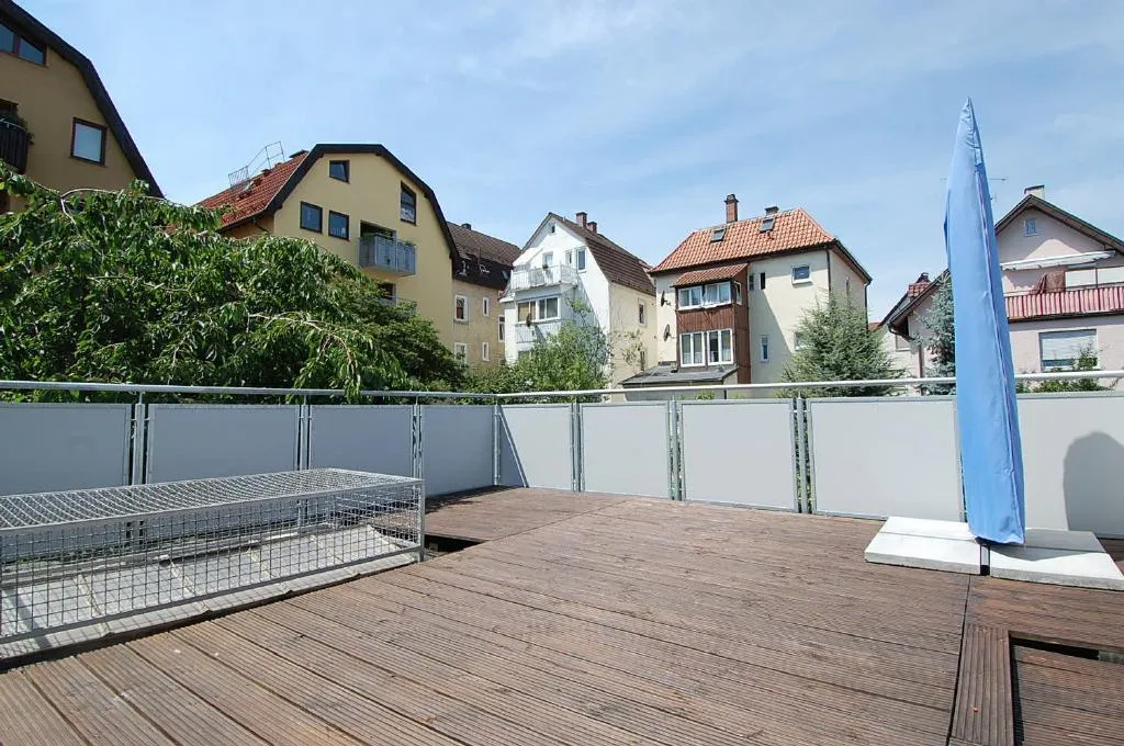 Die sonnige Dachterrasse mit einer Fläche von ca. 17,5 m², die über einen Steg erreicht werden kann, gehört ebenfalls zur zu dieser Wohnung.