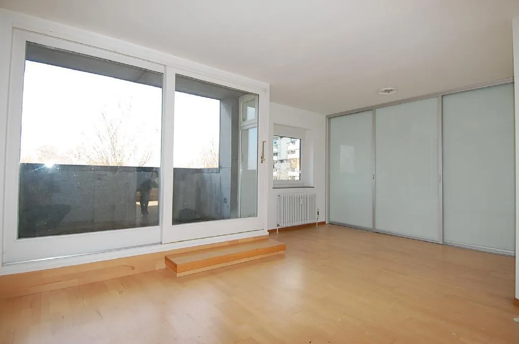 Das Wohn-/ oder Schlafzimmer ist mit Laminat und einem Einbauschrank mit Milchglas-Schiebetüren ausgestattet. Von hier aus ist eine Nord-West-Terrasse zugänglich.