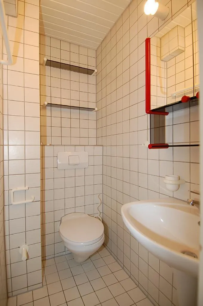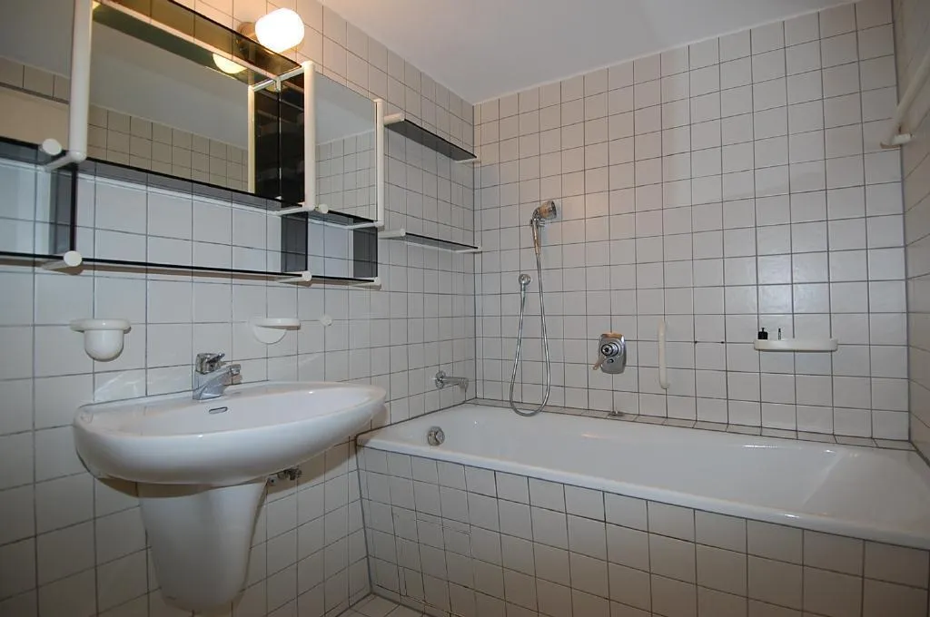 Auf dieser Etage befindet sich ein raumhoch weiß gefliestes Bad mit Wanne und WC. Es ist eine zusätzliche Nord-Terrasse vorhanden.