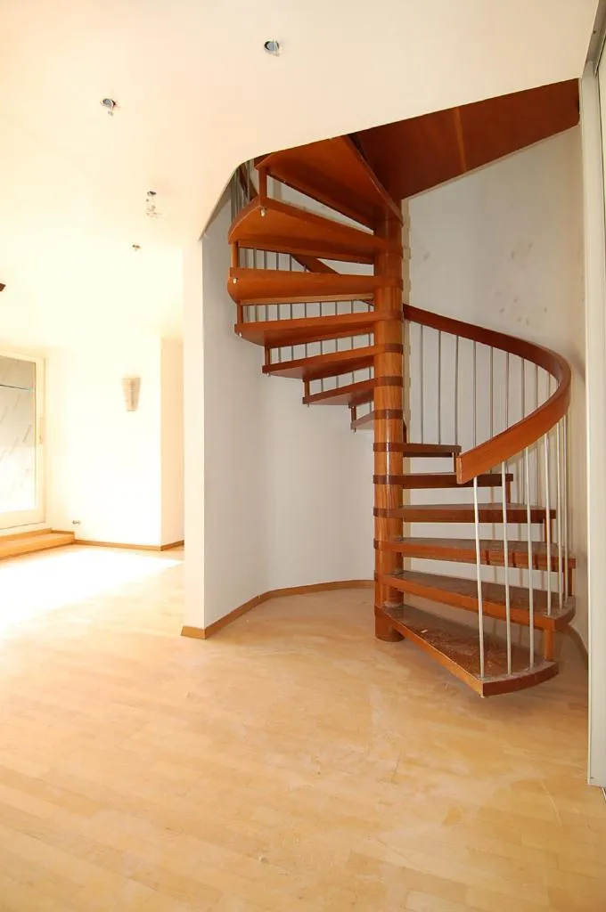 Der Aufgang in die obere Etage erfolgt über eine Holz-Wendeltreppe.
