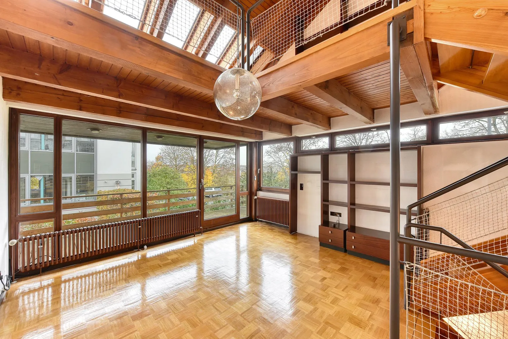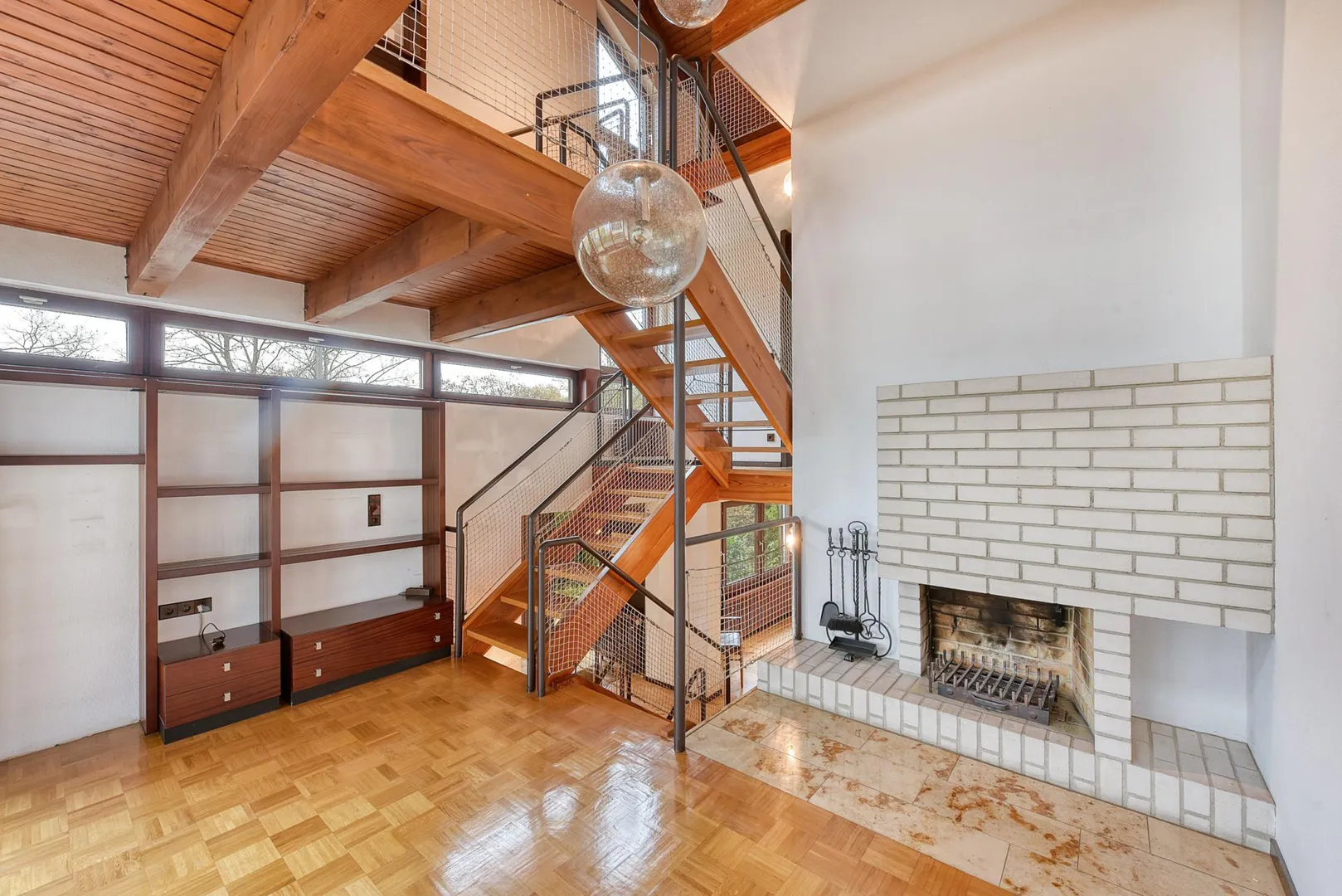 Auf der Wohn-Ebene befinden sich der Wohnbereich mit offenem Holz-Kamin und Balkon-Zugang. Der Balkon verfügt zusätzlich über einen Aufgang an der Nord-Hausseite.