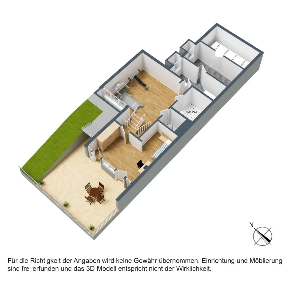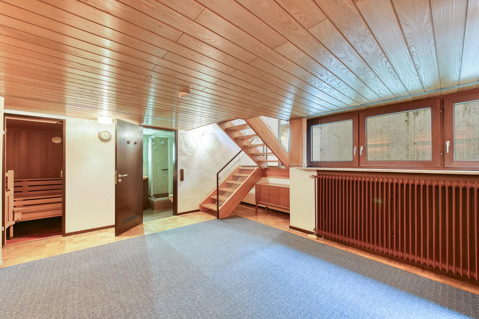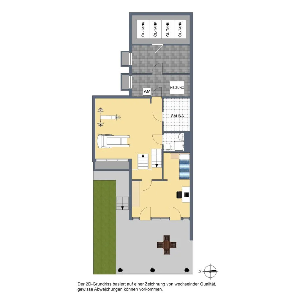 Auf der untersten Ebene befinden sich ein großzügiger, offener Hobbyraum, ein Bad mit Dusche, eine Sauna, der Heiz-/Waschraum, zwei Abstellräume sowie der Öl-Tank-Raum.