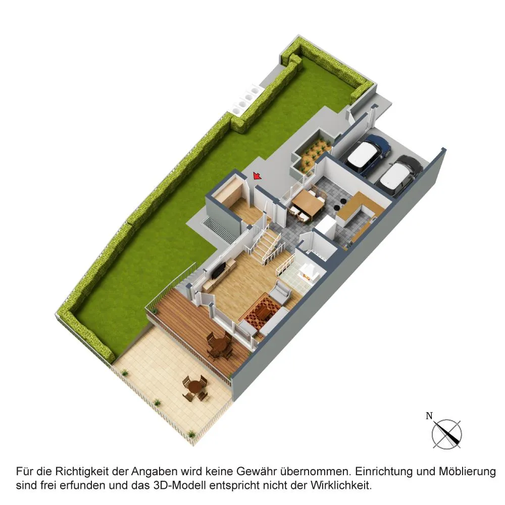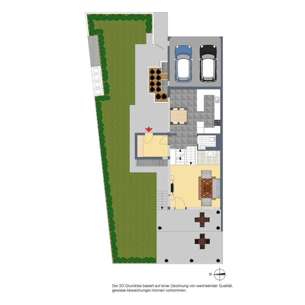 Der Hauszugang sowie die Doppel-Garage befinden sich an der Ost-Grundstücksseite.