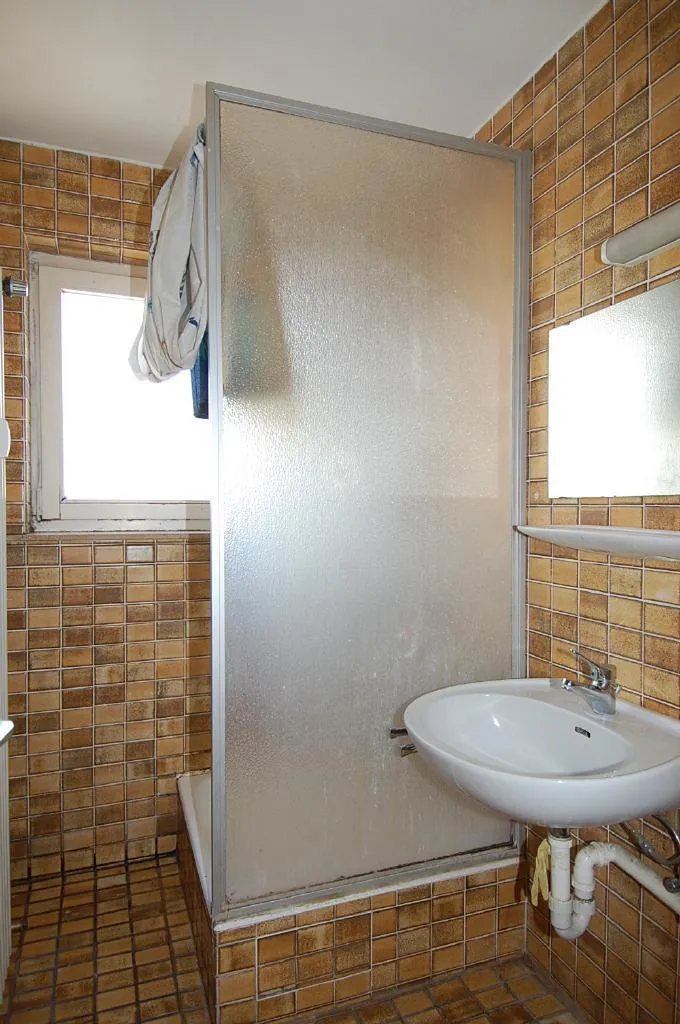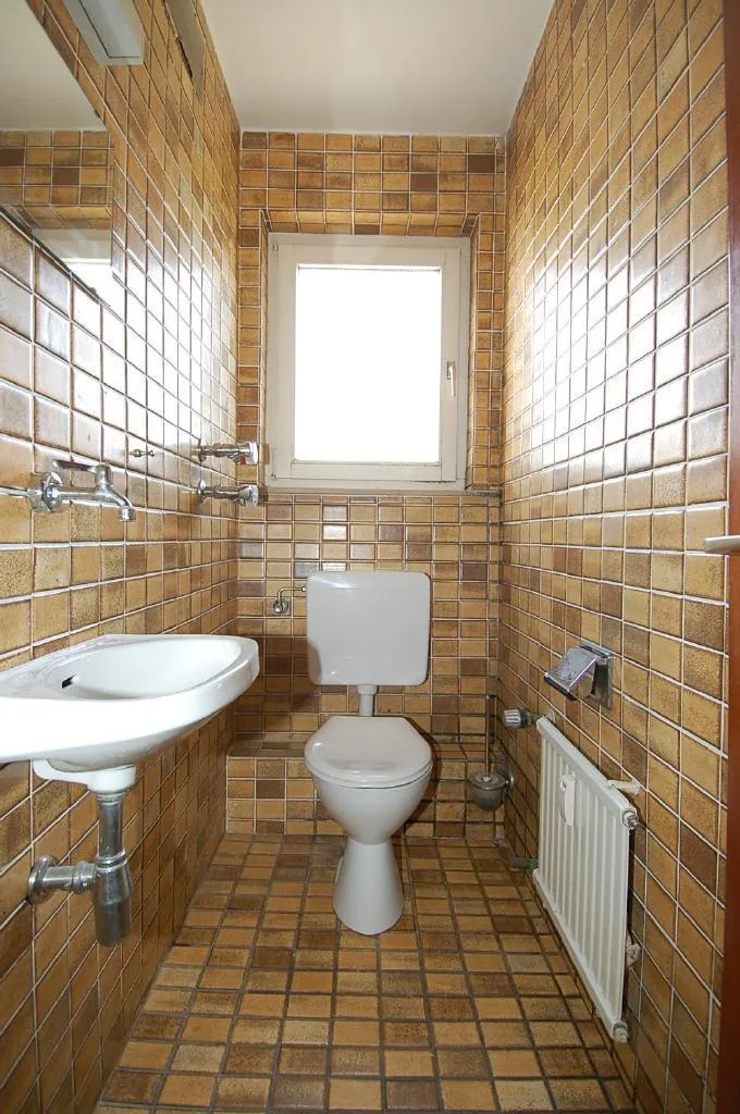 Das Tageslichtbad ist raumhoch mit den ursprünglichen Fliesen, einer Dusche, einem Waschbecken und dem Waschmaschinenanschluß ausgestattet. Das separate WC ist ebenfalls mit den ürsprünglichen Fliesen und einem Fenster ausgestattet.