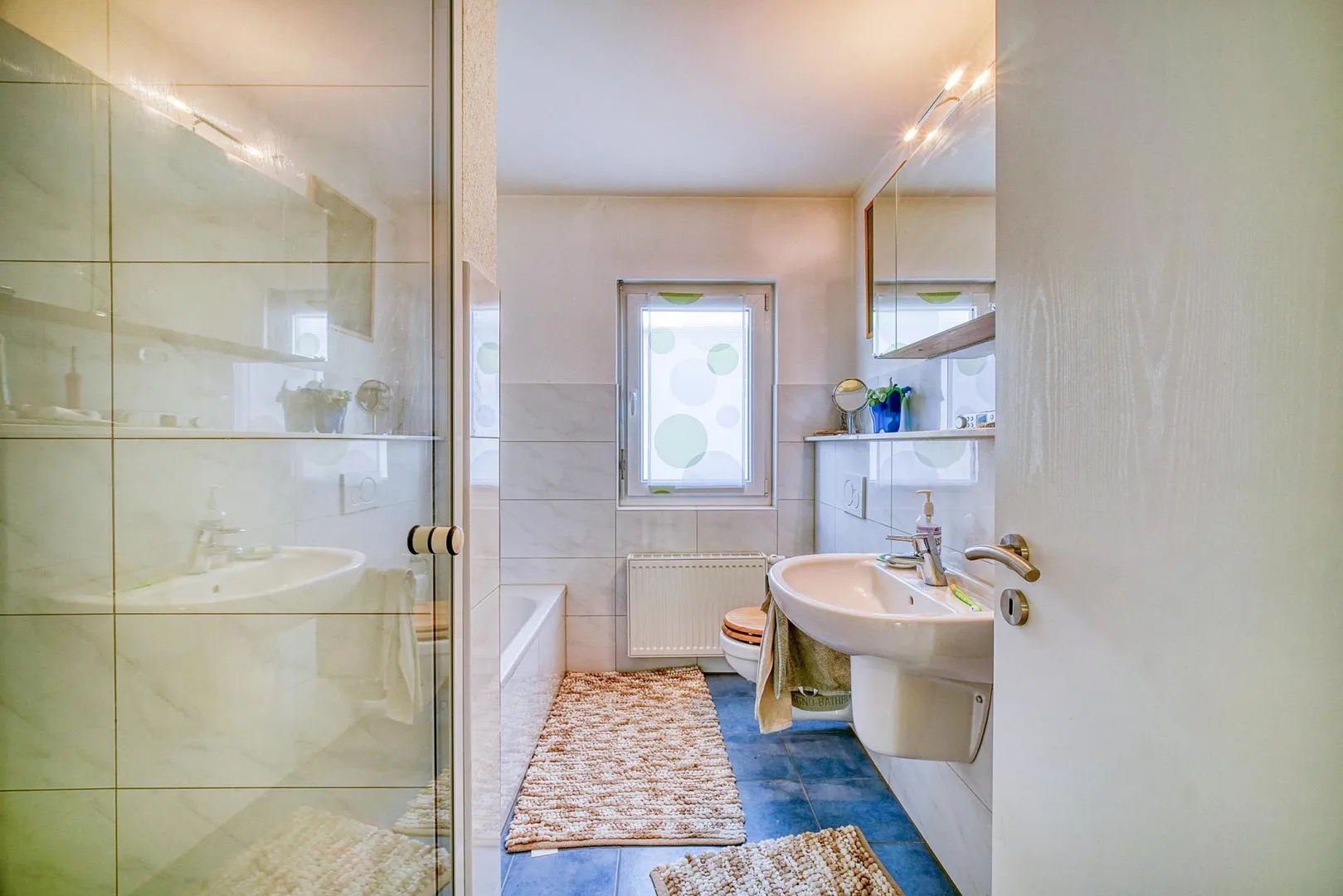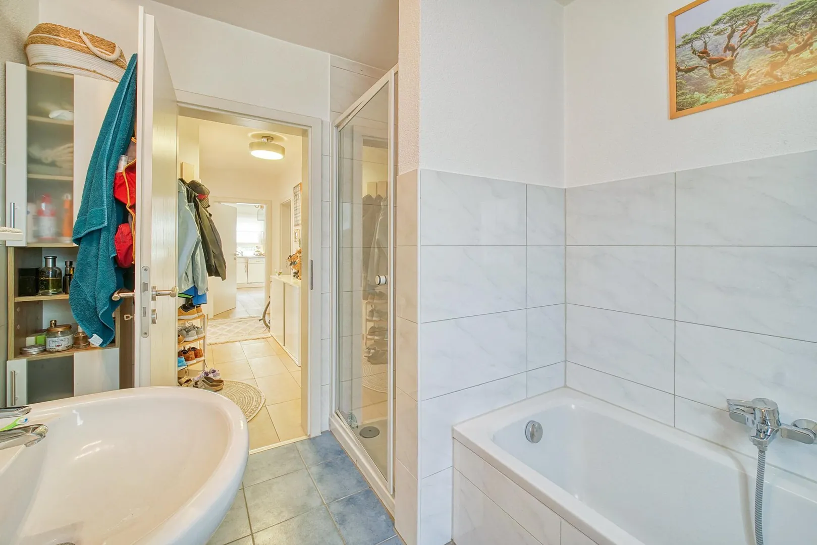 Die Badezimmer ist teilweise raumhoch, weiß gefliest und mit einer Badewanne, einer Dusche, einem Waschbecken sowie einem WC ausgestattet.