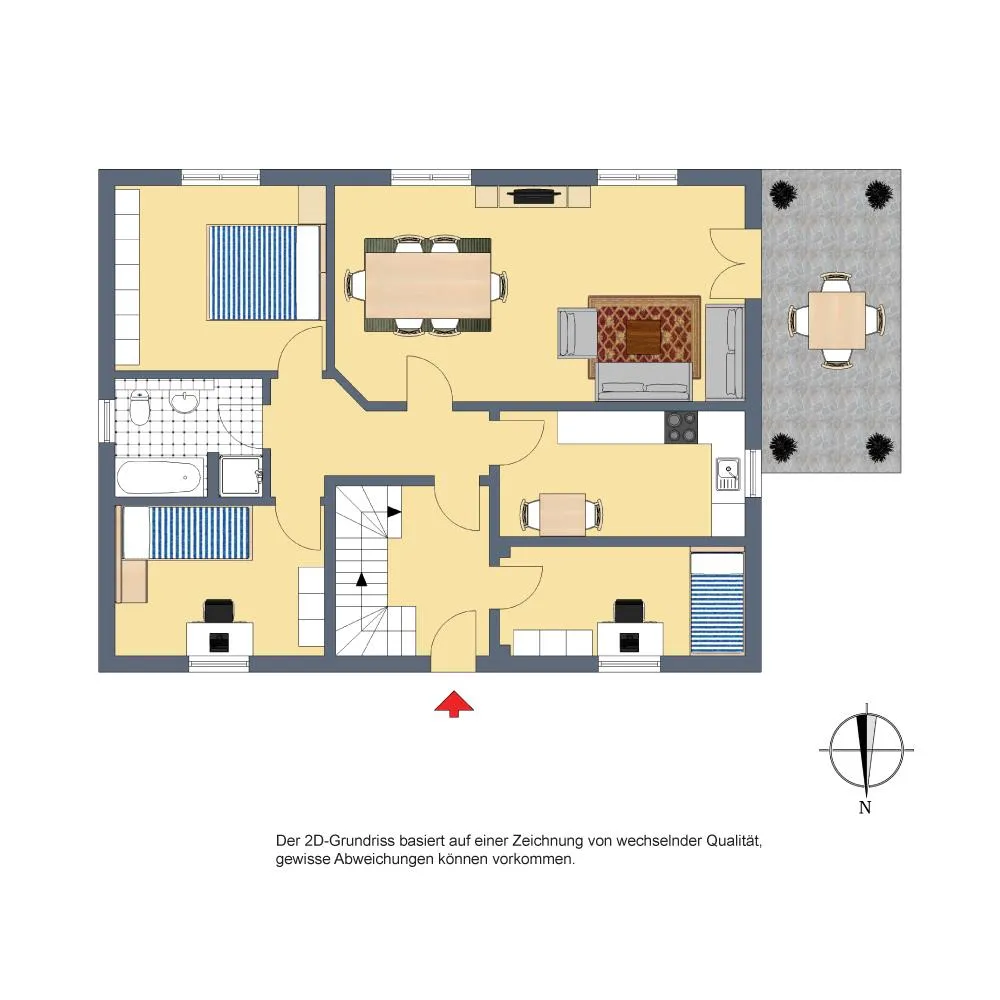 Der Grundriss ist sehr gut. Alle Räume sind direkt vom Flur begehbar. Das Badezimmer verfügt über ein Fenster. Die Süd-West Terrasse ist über das Wohnzimmer begehbar.
