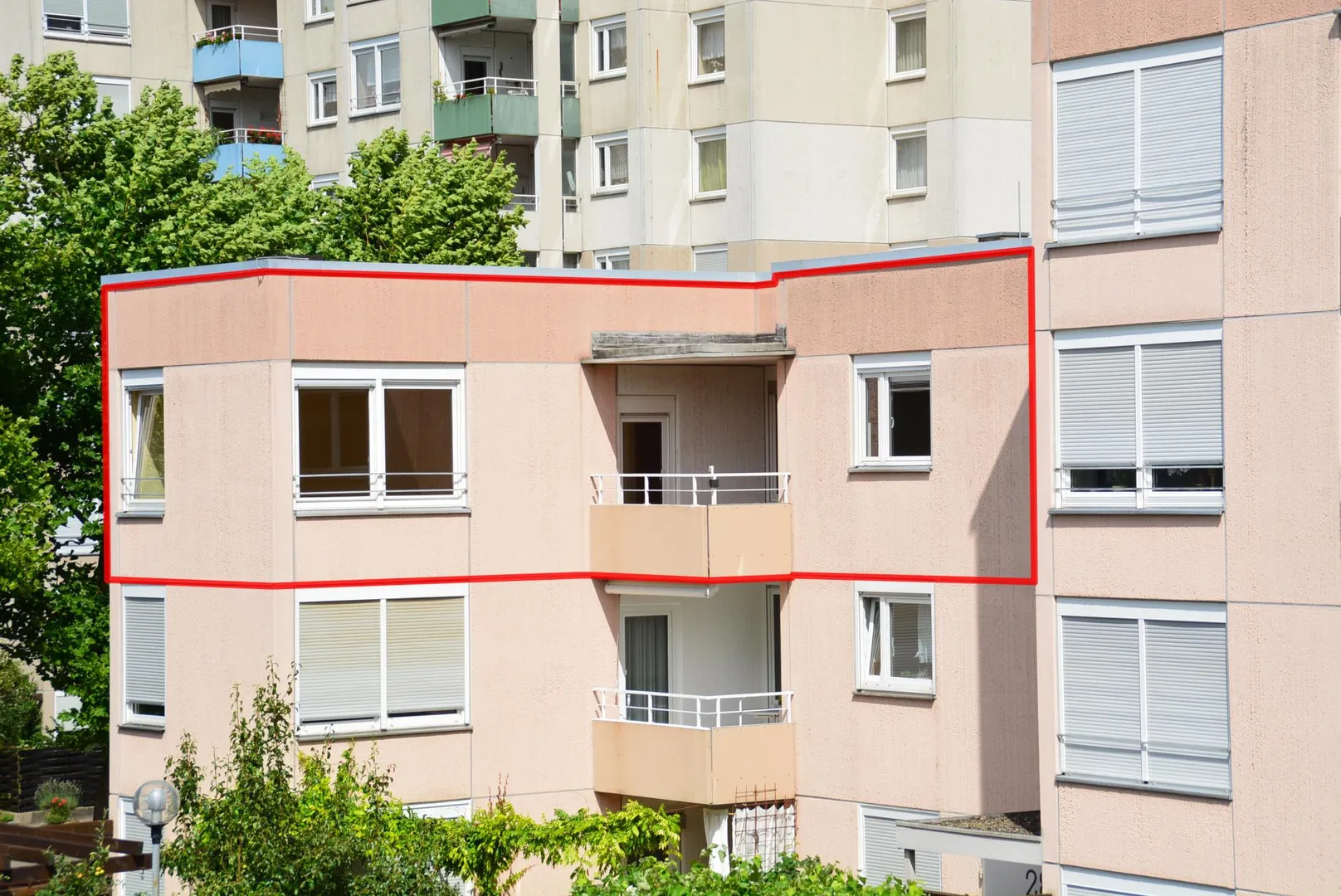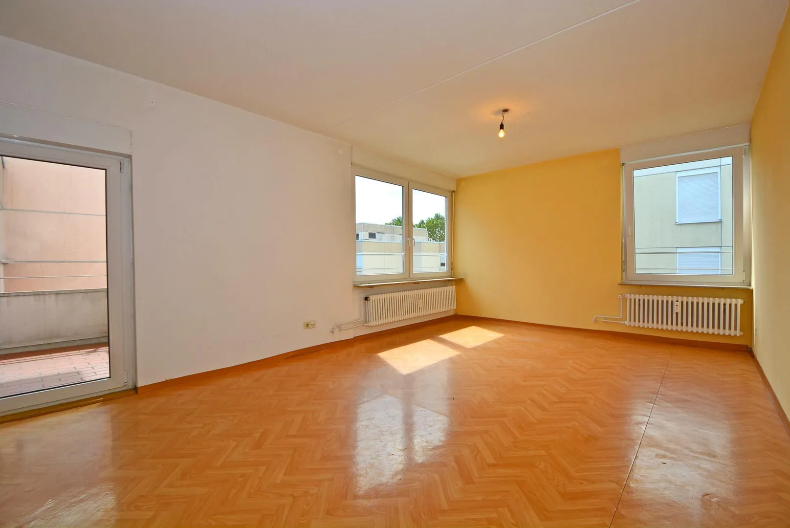 Der ca. 6 m² große und überdachte Süd/West-Balkon ist vom Wohnzimmer begehbar.