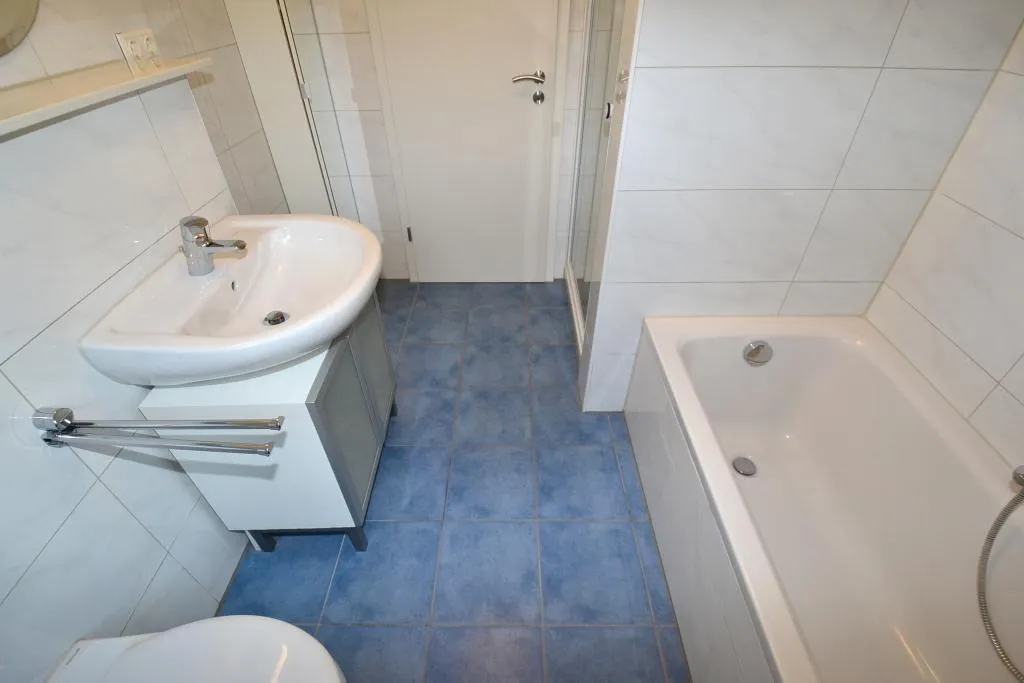 Die Badezimmer ist raumhoch, weiß gefliest und mit einer Dusche, einer Badewanne, einem Waschbecken und einem WC ausgestattet.